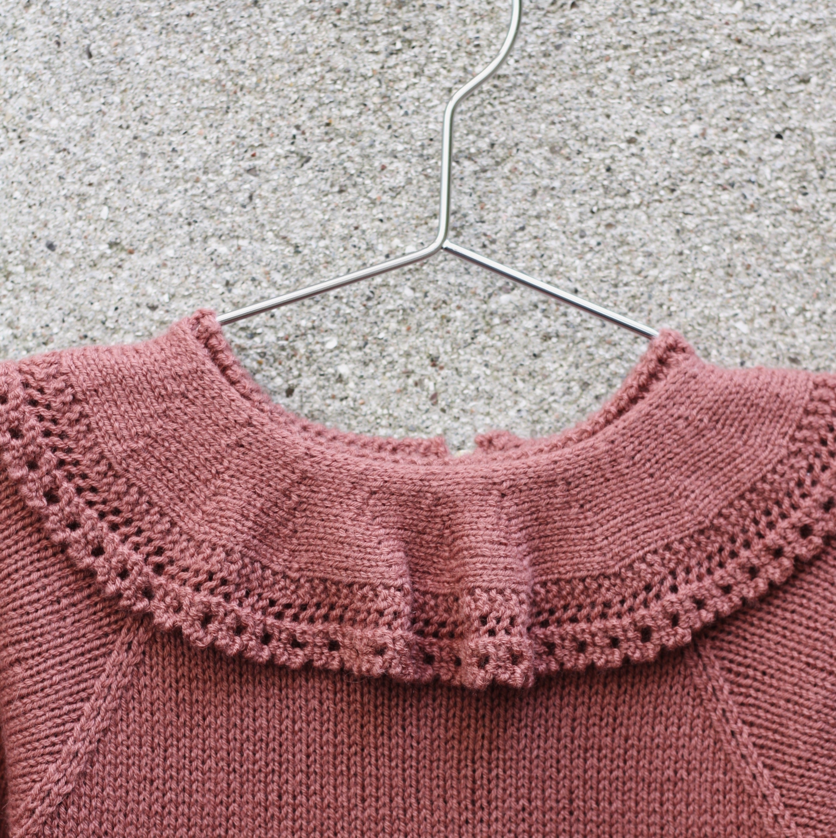 Agnes Romper Dress ist ein Kleid und ein Strampler in einem mit einem weiten Rock und einem breiten, leicht gerüschten Kragen. Das Strampelkleid wird von unten nach oben gestrickt, sowohl flach als auch in der Runde, mit 1 Faden aus Merino, Cotton Merino oder Pure Silk.