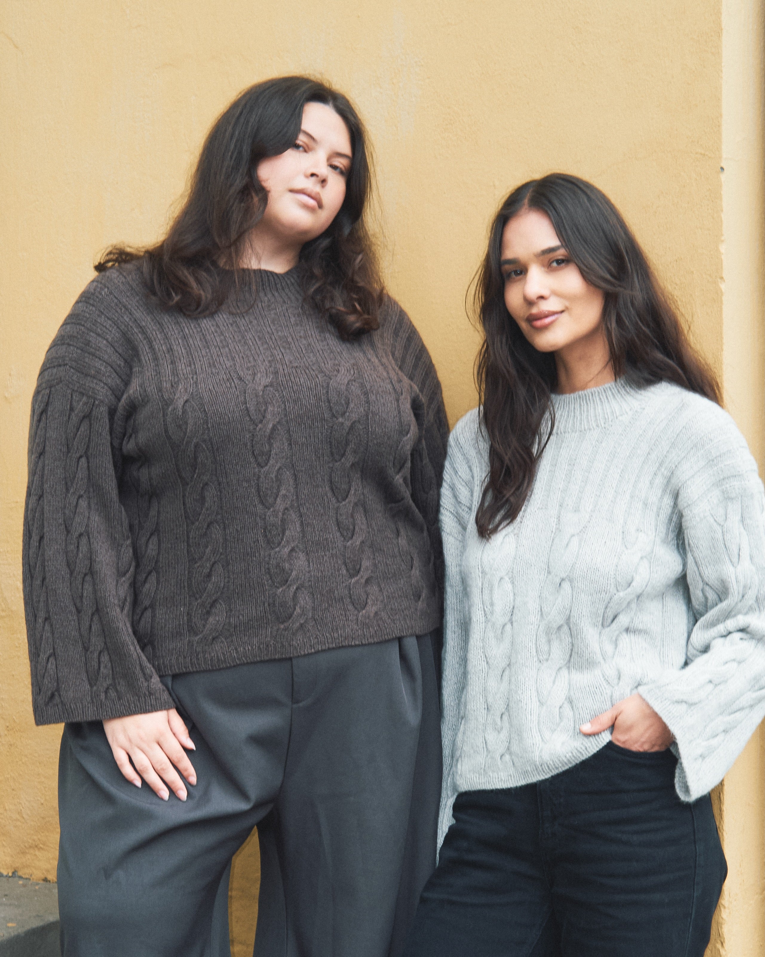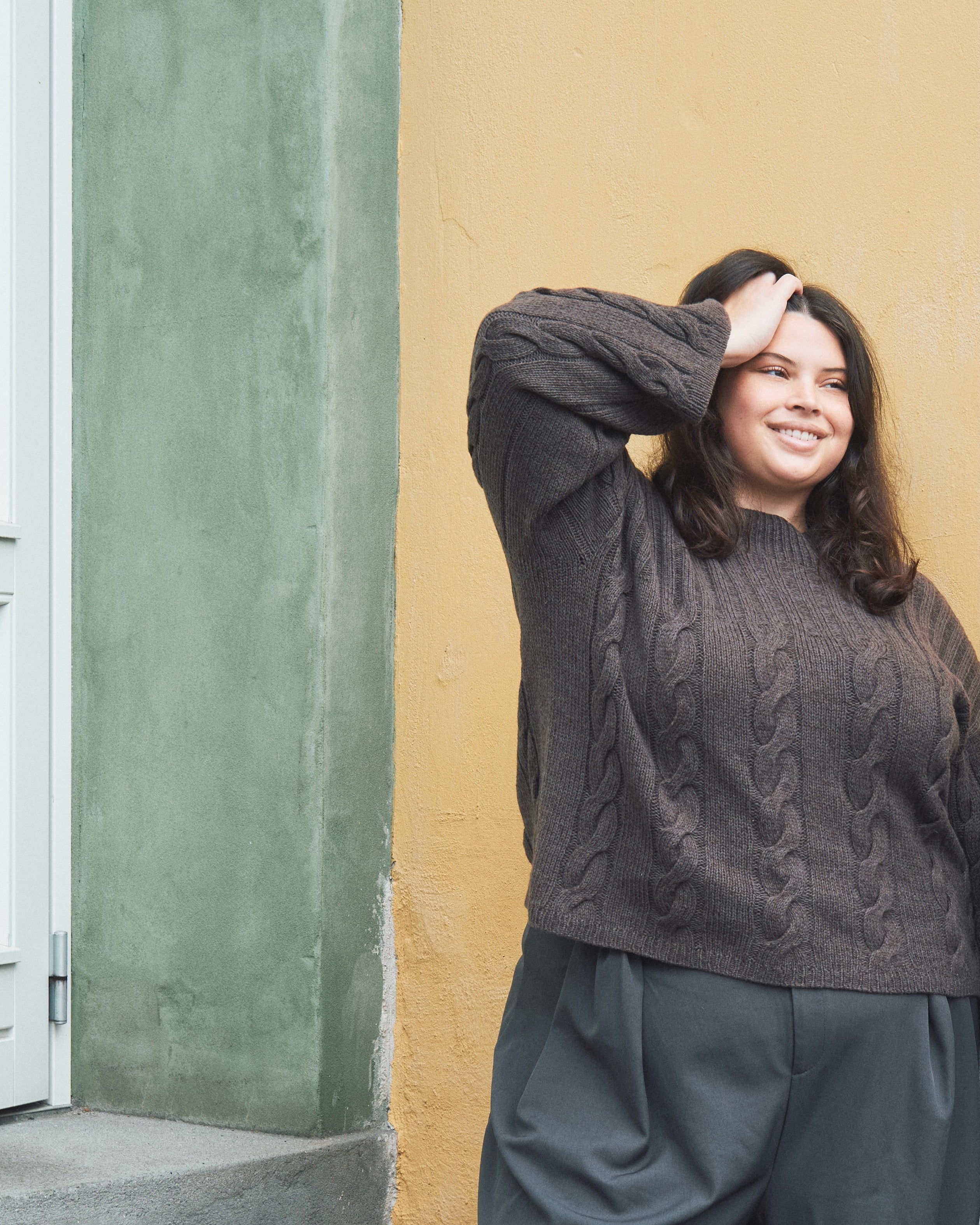 Der Cobra Sweater ist eine moderne Variante des klassischen Zopfpullovers, bei dem Zopfmuster und Rippstrick auf unkonventionelle Weise kombiniert werden. Der Pullover hat eine lockere Passform mit weiten Ärmeln und wird von oben nach unten gestrickt, sowohl flach als auch in der Runde, mit 1 Faden Merino + 1 Faden Soft Silk Mohair , die durchgehend zusammengehalten werden. Die Passe wird zuerst in Hin- und Rückreihen gestrickt, bevor Sie die Passe und den Körper in der Runde weiterstricken. Danach werden die Maschen für die Ärmel aufgenommen und die Ärmel mit kurzen Reihen geformt, bevor sie in der Runde weitergestrickt werden. Zuletzt werden die Maschen für das Halsband aufgenommen, das in Rippen gestrickt wird.