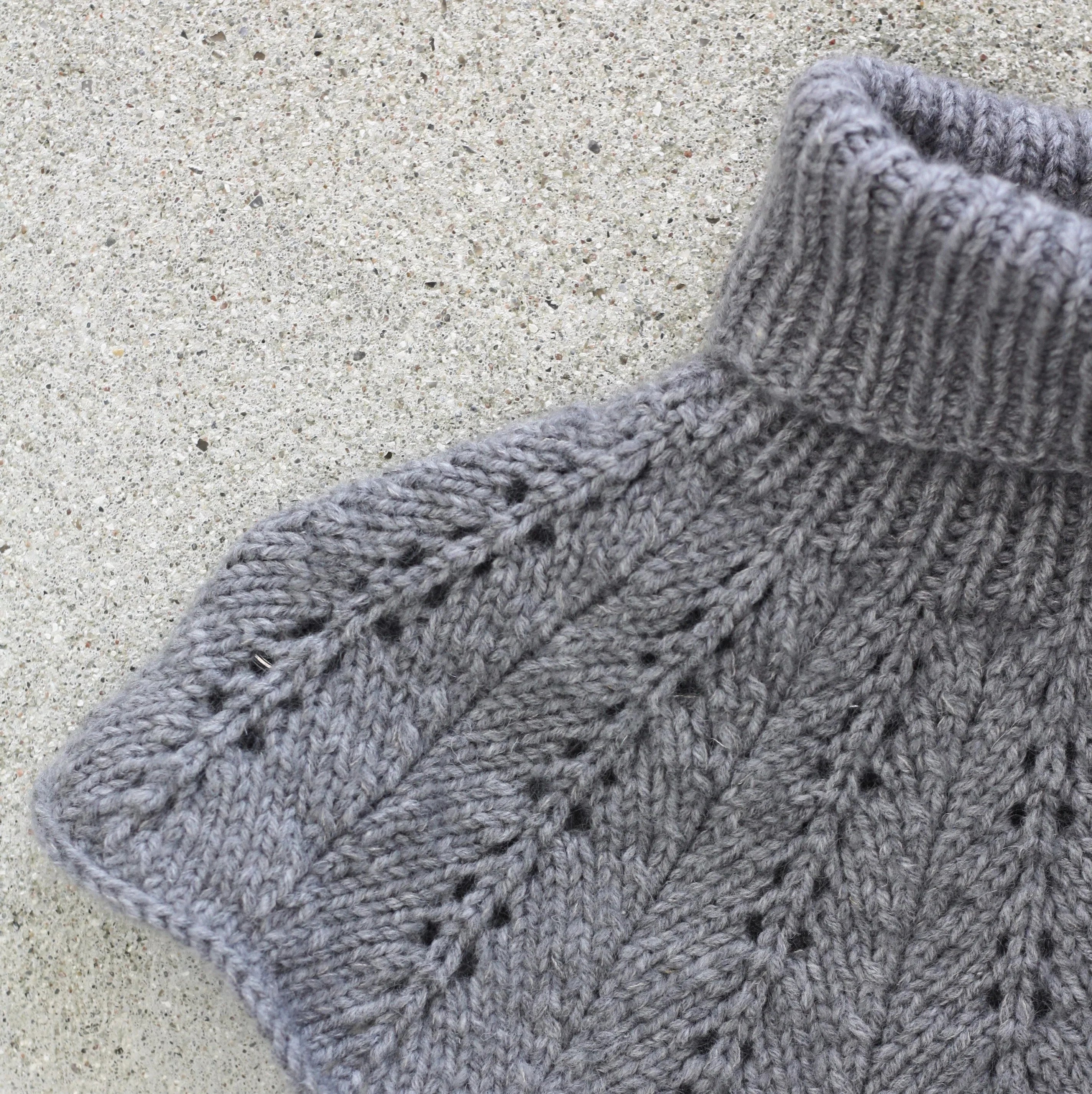 Der abgebildete Fern Collar ist aus Heavy Merino - Stone und Soft Silk Mohair – Rainy Day gestrickt