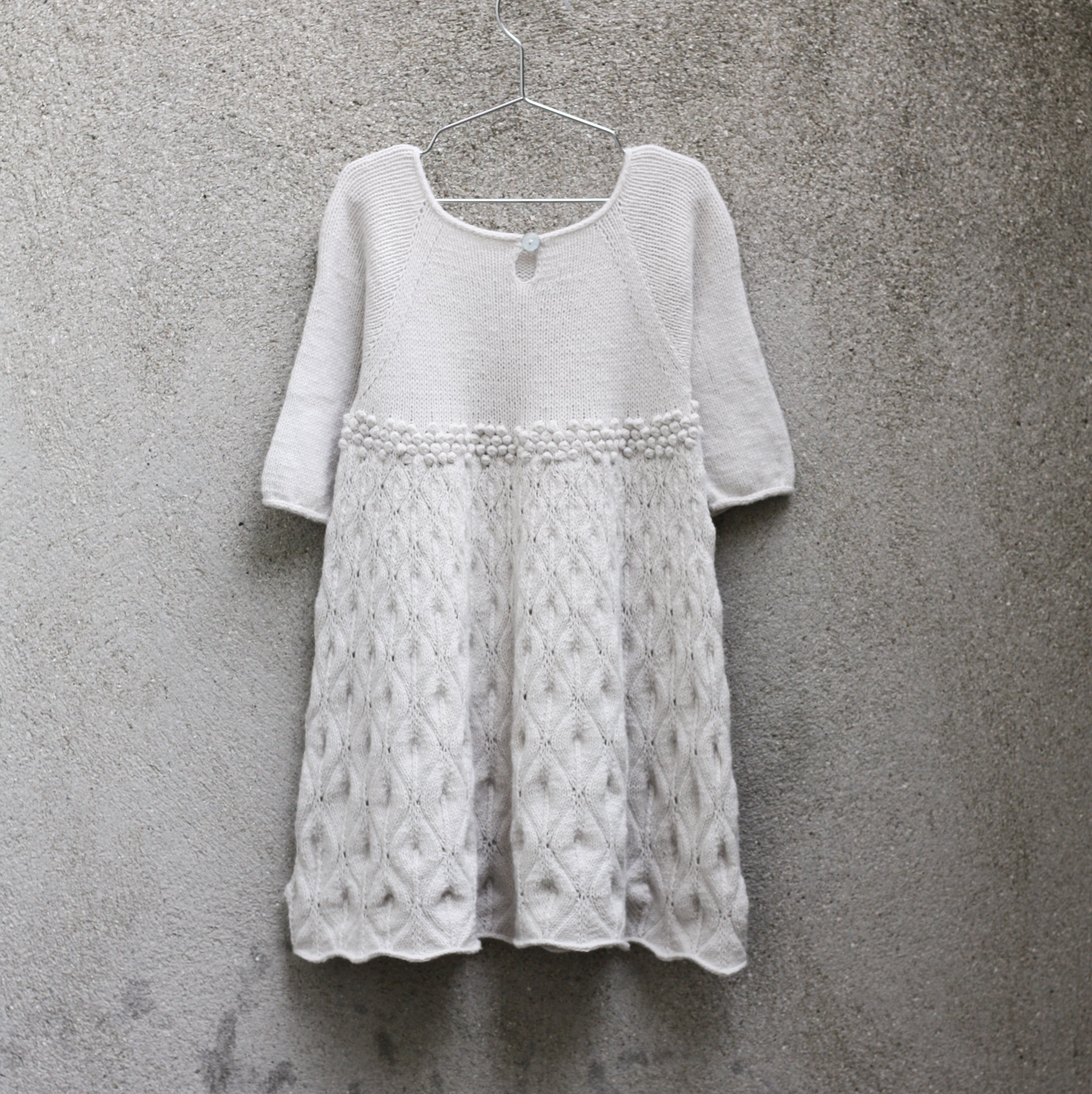 Das Kleid wird von oben nach unten gestrickt. Zuerst in Reihen, um einen Schlitz im Nacken entstehen zu lassen, danach in Runden. Der Halsausschnitt wird mit verkürzten Reihen geformt. Perlen und Rock werden nach Diagramm gefertigt. Die Ärmel werden glatt rechts in Runden bis zu einer ¾ Länge gearbeitet. Ärmel und Halsausschnitt werden mit einem I-Cord Rand beendet.