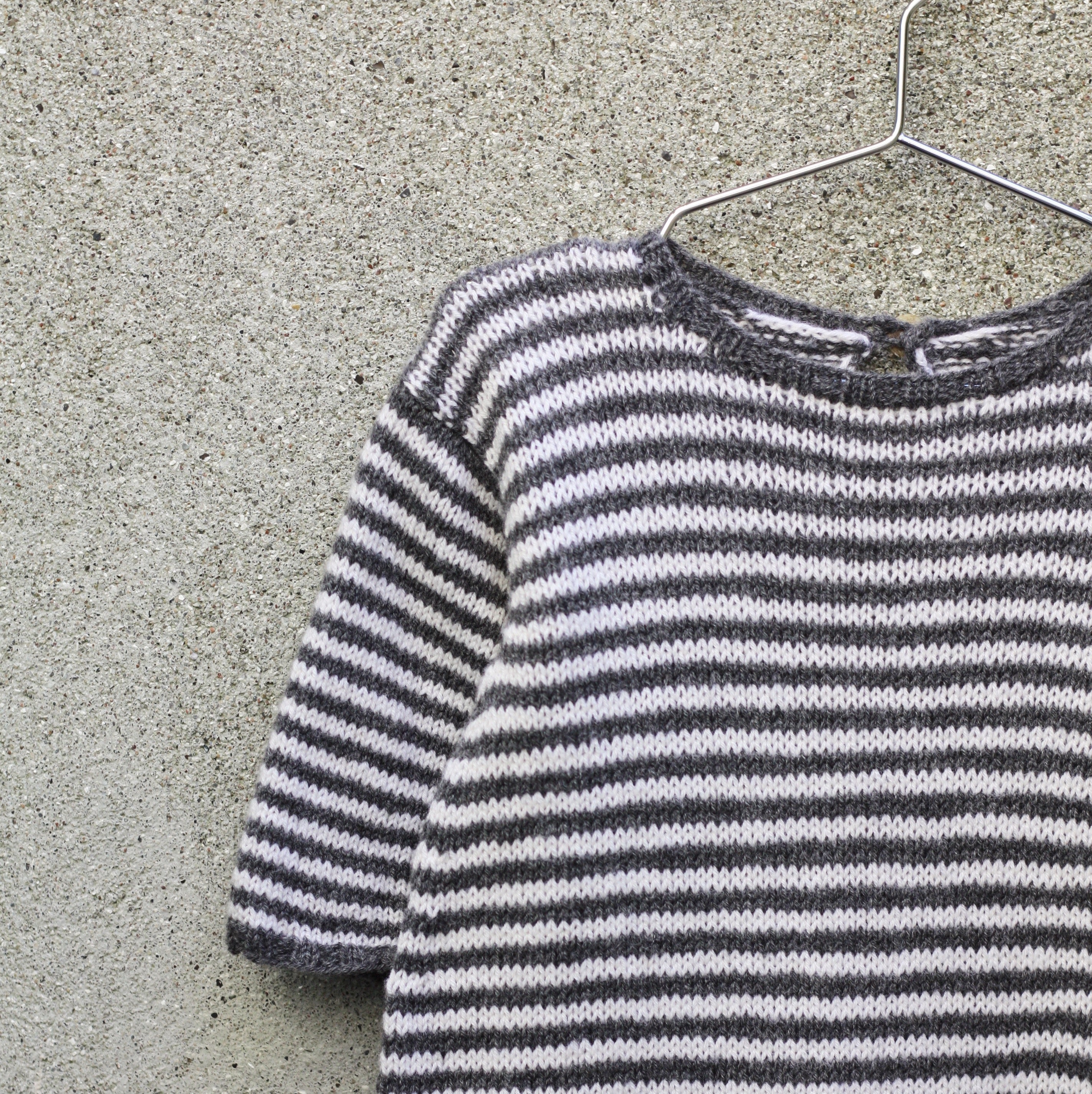 Der Jumpsuit ist gestrickt in Knitting for Olive Merino - Thunder Cloud and Cream colorway.
