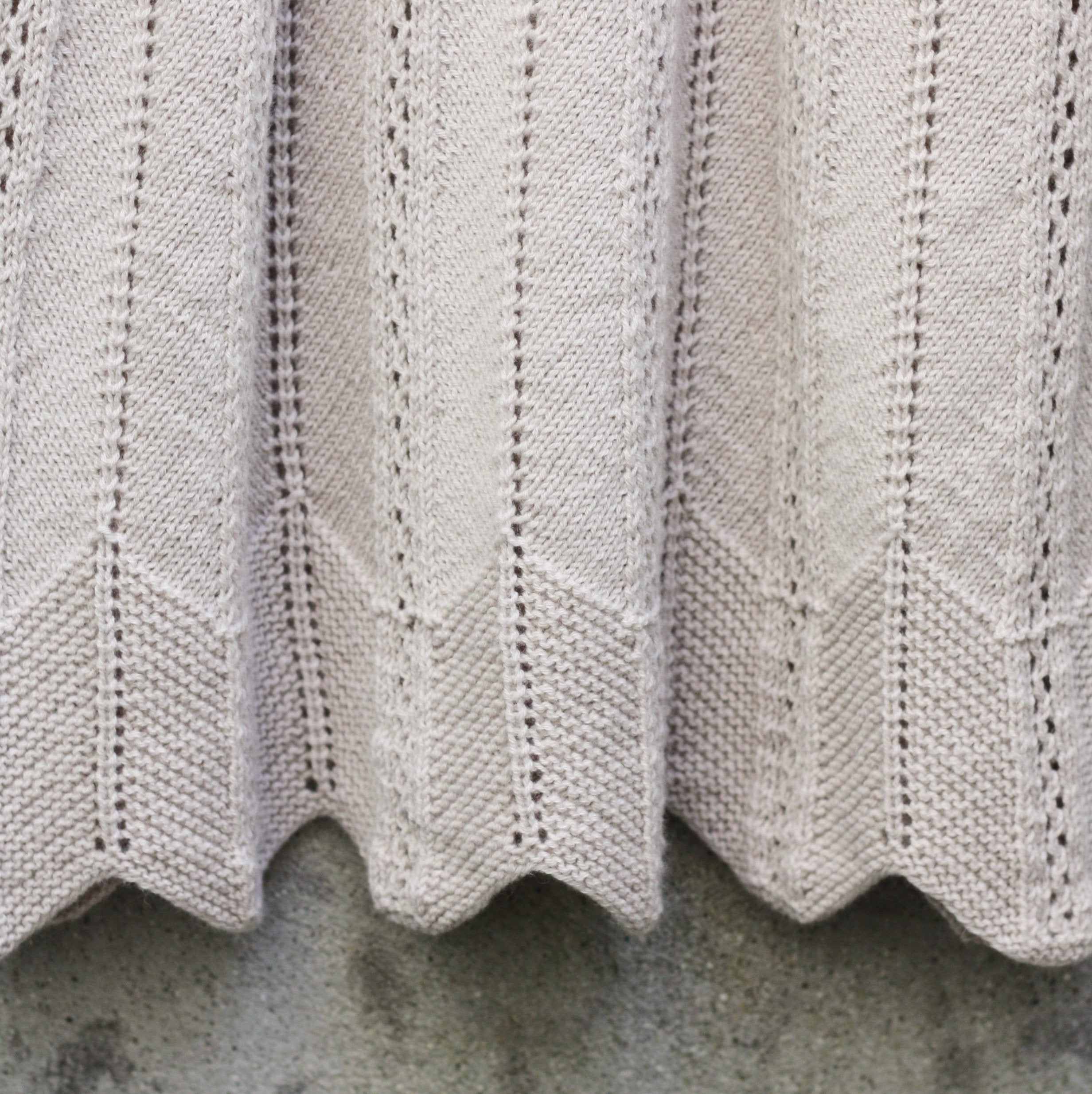 Das Lochmuster des Rocks wiederholt sich an den Ärmeln. Das Kleid wird in Runden von unten nach oben gearbeitet. Rock und Ärmel beginnen mit Krausrippen und gehen in das Muster des Randes über, bevor das dominante Lochmuster auf dem Rock gestrickt wird. Die Passe erfolgt mit Raglanabnahmen.
