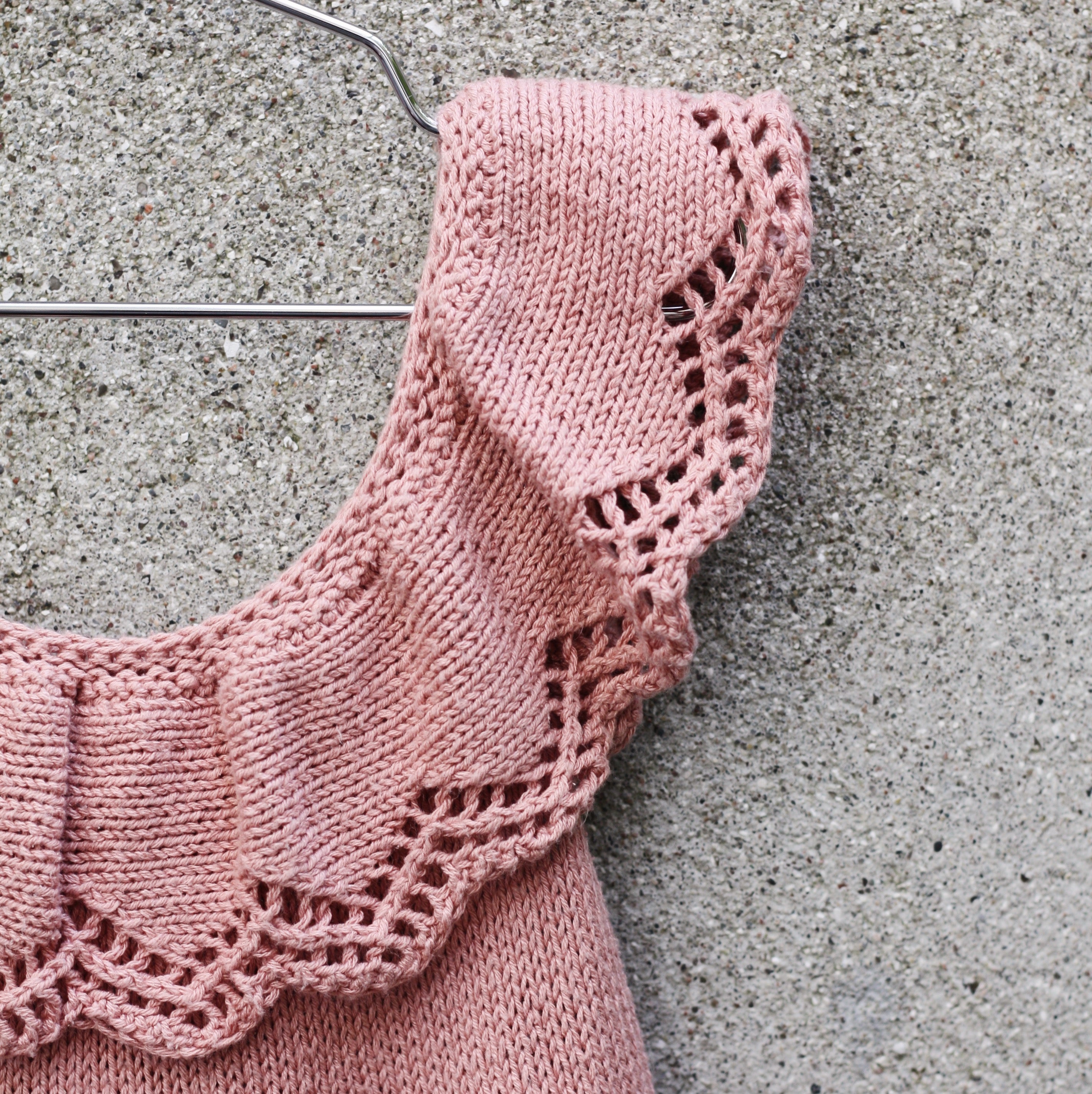 Vous commencez à travailler le volant dans un sens et dans l'autre en suivant le diagramme. Ensuite, l'empiècement est travaillé dans un sens et dans l'autre en jarretière maille avant que le volant et l'empiècement ne soient assemblés en tricotant les deux pièces ensemble. La jupe est ensuite travaillée en rond en stockinette maille tout en étant modelée pour créer plus de largeur. La longueur de la robe peut être facilement ajustée.