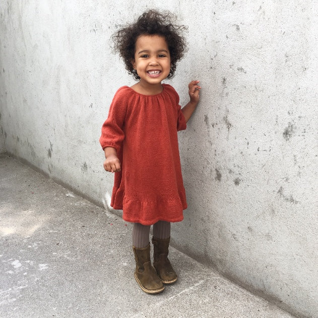 La Augusta Dress est une robe simple en maille stockinette avec des manches 3/4, un empiècement froncé et un volant sur le bord inférieur. La coupe ample de la robe donne à l'enfant suffisamment d'espace pour jouer et bouger. Elle est travaillée sans couture du haut vers le bas en utilisant un fil de mérinos, de coton mérinos ou de Pure Silk.