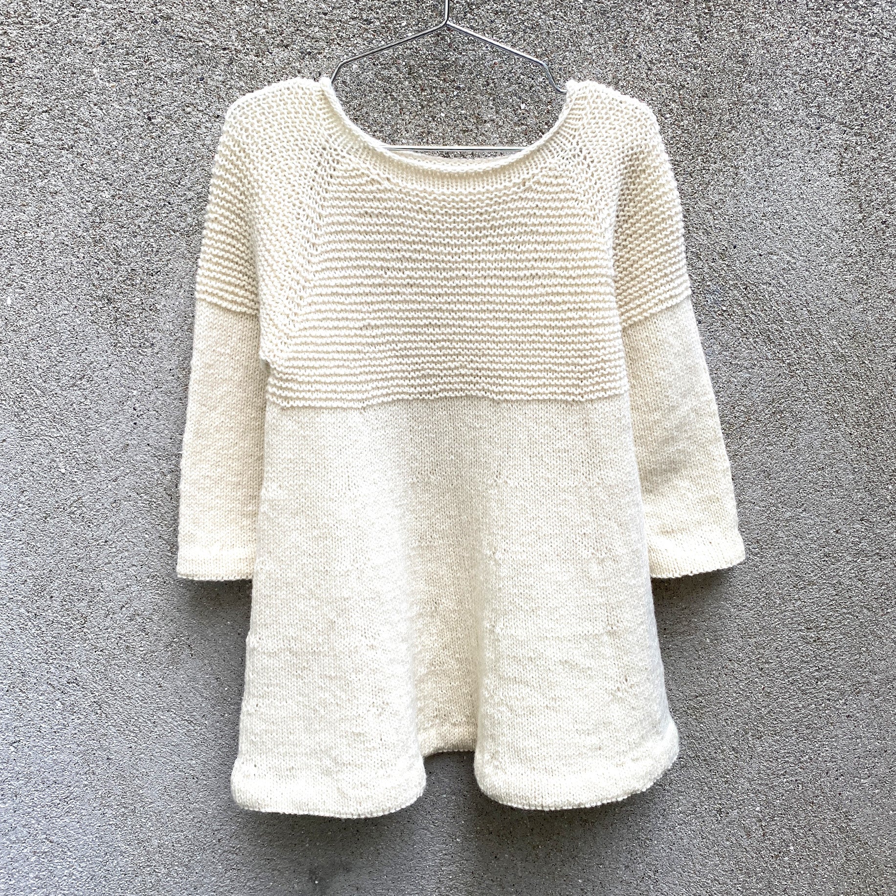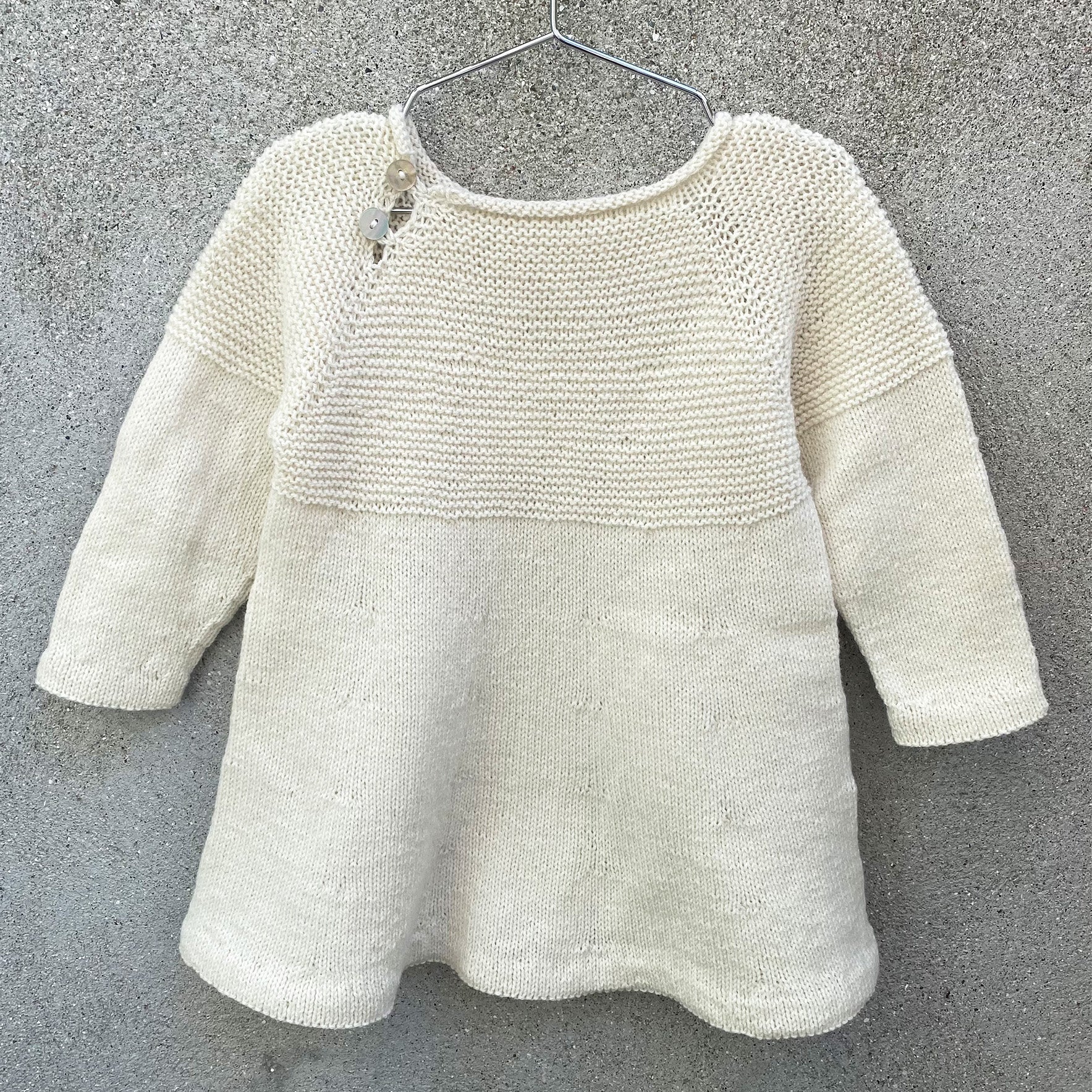 Bobby Dress est une robe simple avec un empiècement maille jarretière. La robe est travaillée du haut vers le bas en utilisant un fil de mérinos, de coton mérinos ou de Pure Silk.
