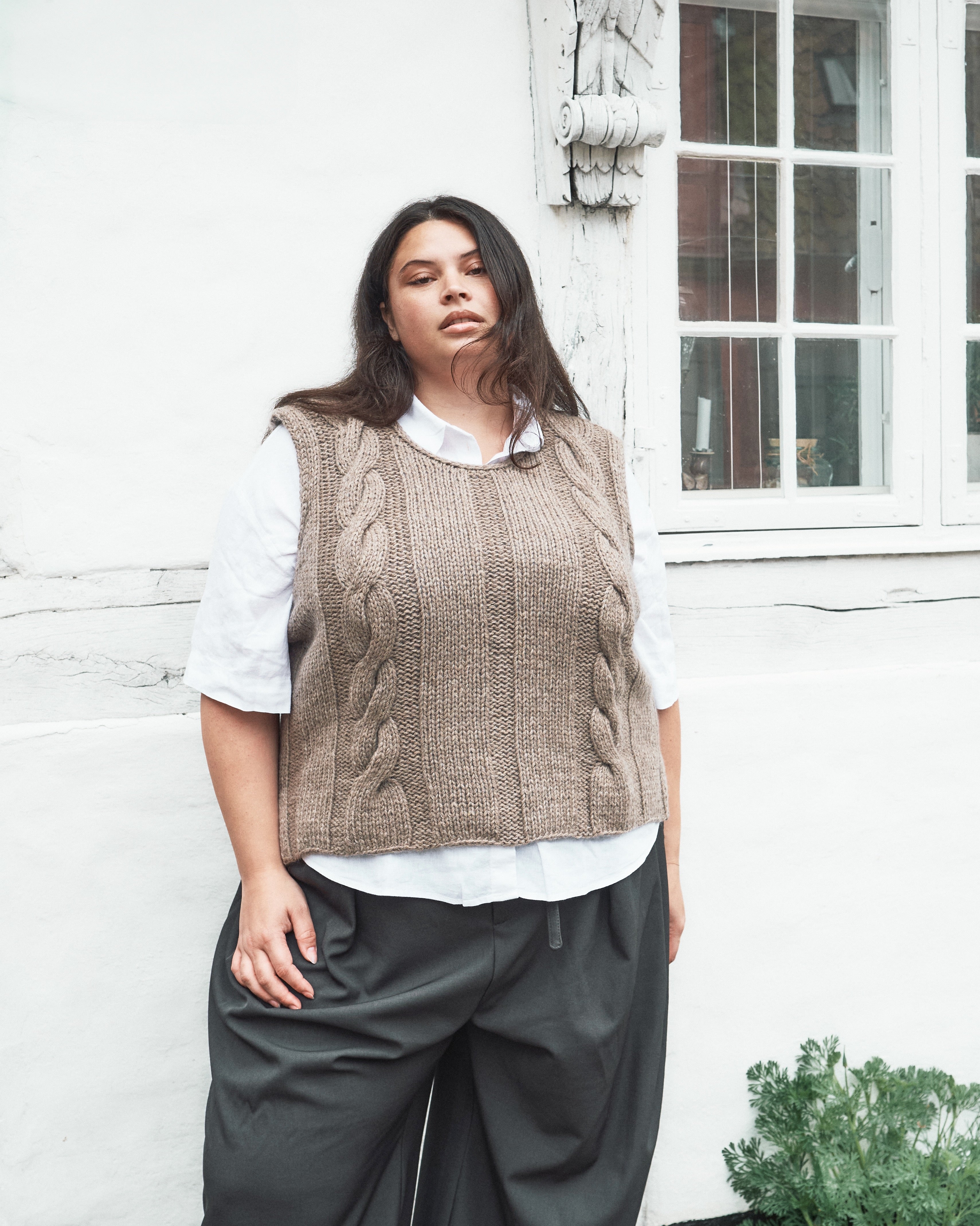 Emma Slipover est un pull simple et élégant avec de larges câbles sur le devant et le dos. Il est travaillé de haut en bas sur des aiguilles de 7 mm / US10.75 en utilisant 1 brin de Heavy Merino + 1 brin de Merino + 1 brin de Soft Silk Mohair maintenus ensemble.