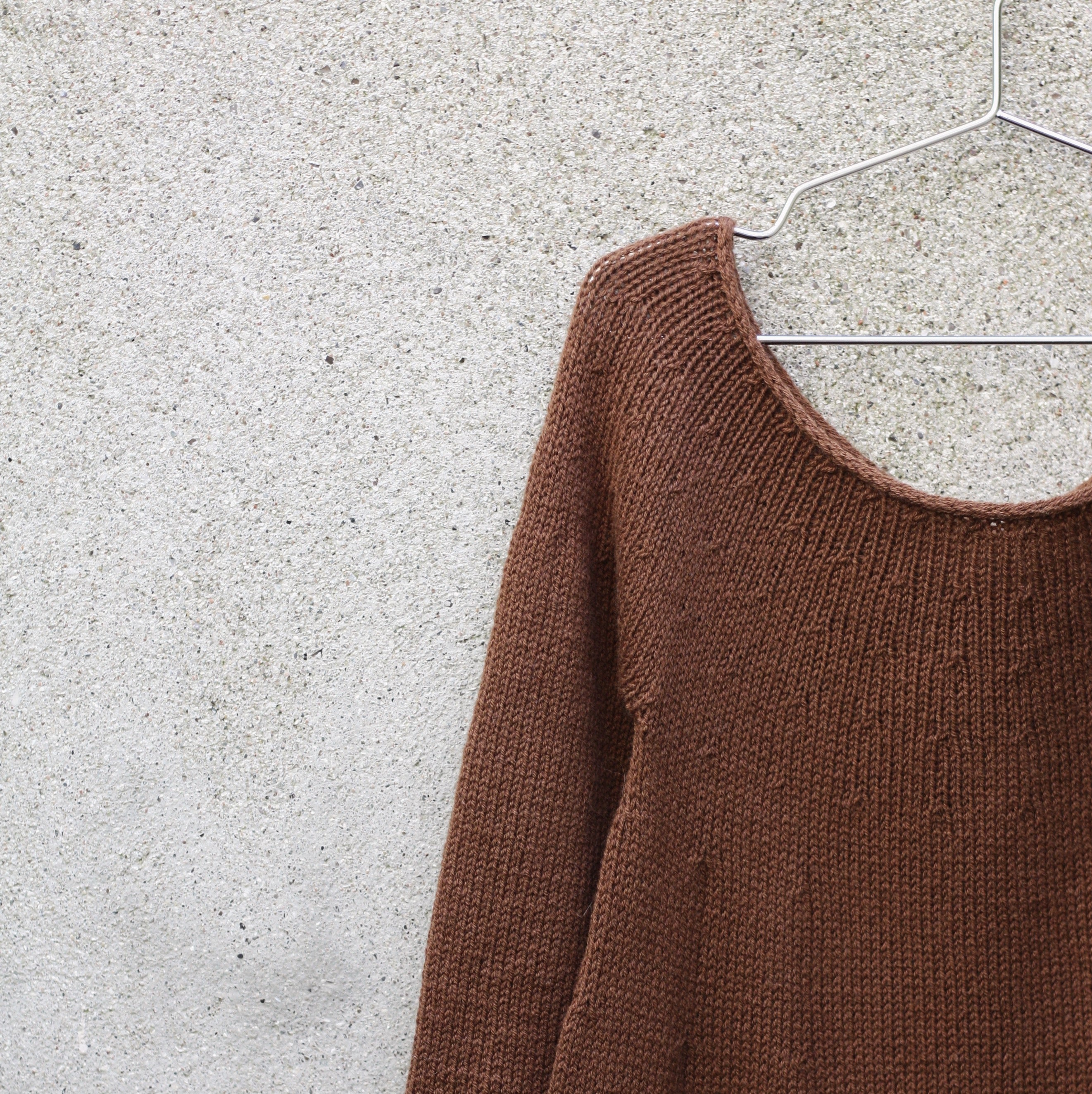 La robe présentée en couverture est tricotée en Merino de chez Knitting for Olive – col. Dark Cognac