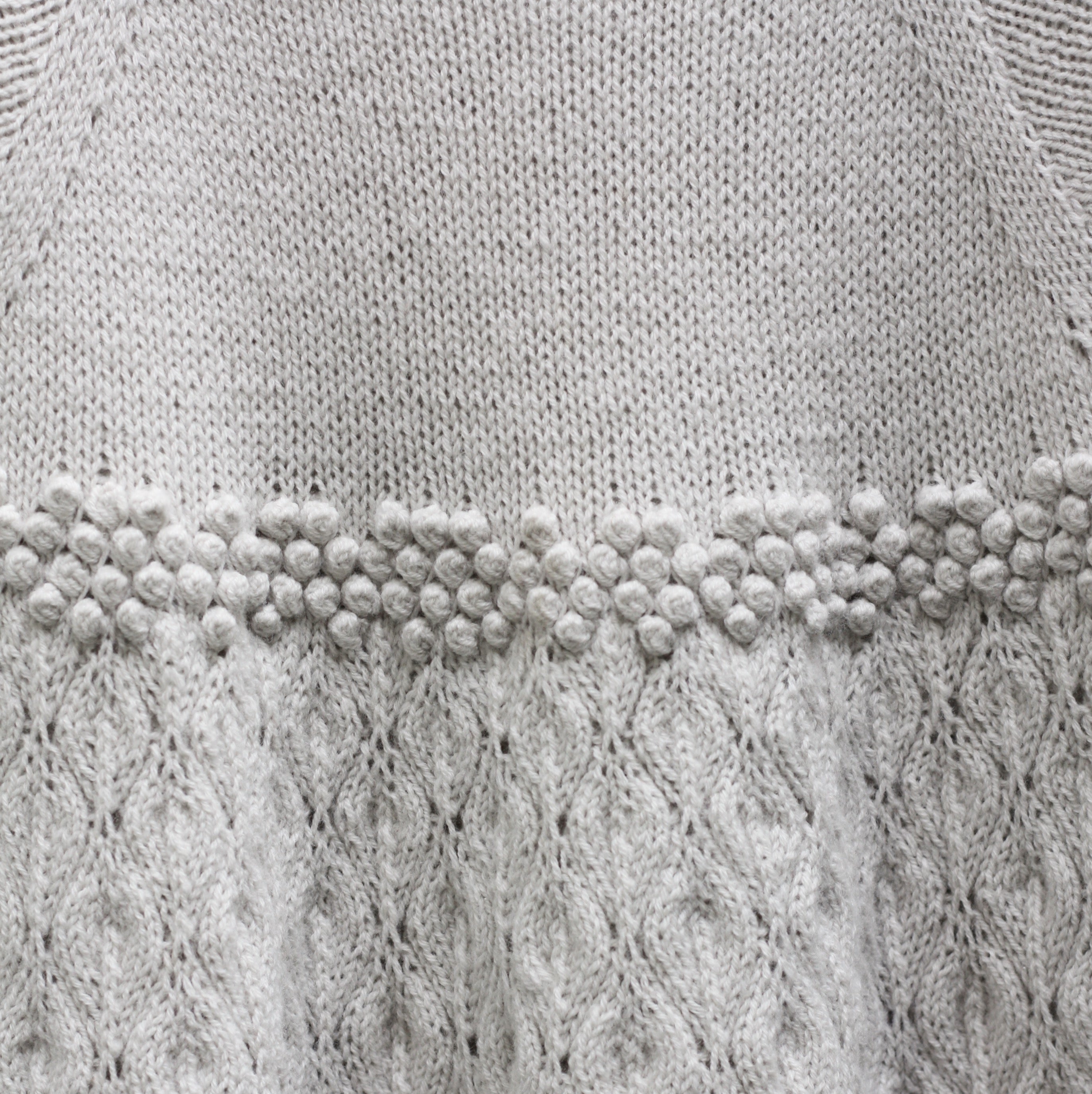 Les nopes et le motif dentelle de la jupe sont tricotées selon des diagrammesLes manches ¾ sont tricotées en rond et en jersey. Les bordures des manches et le col sont terminés par unebordure en i-cord.