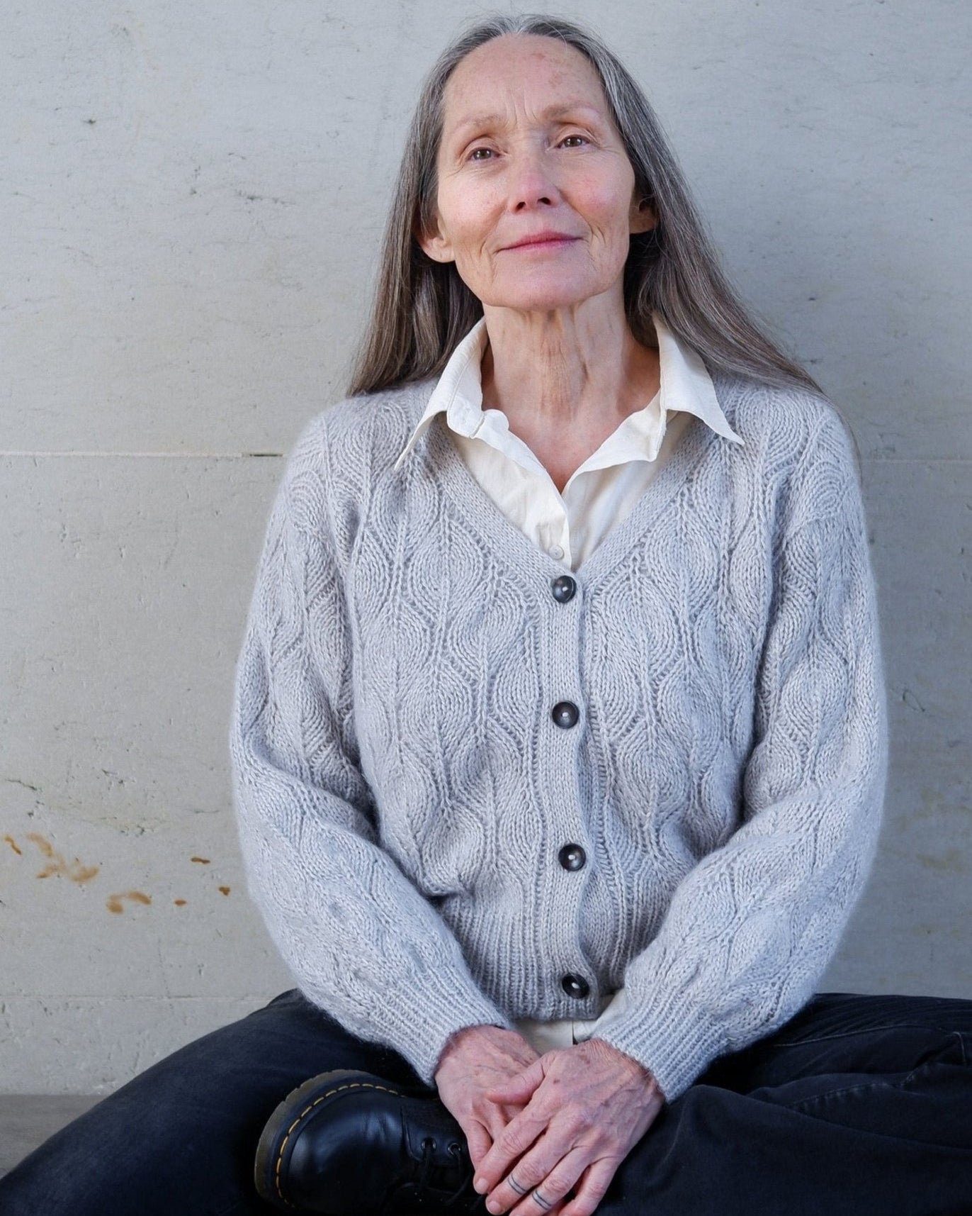 Le modèle sur la photo est tricoté en taille M et en Merino – Pearl Gray et en Soft Silk Mohair – Soft Blue.