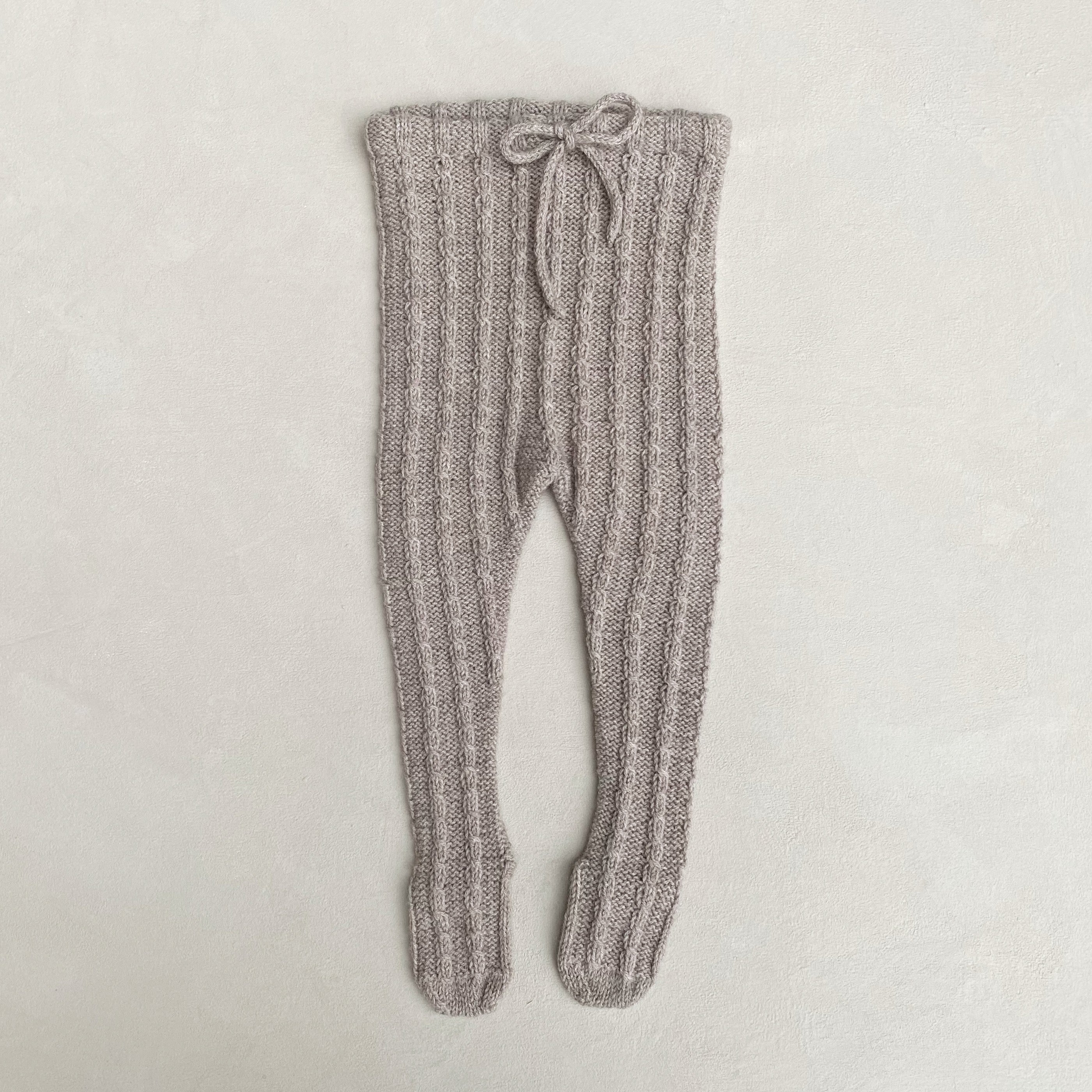 Les Cable Tights sont travaillés en rond du haut vers le bas et façonnés dans le dos avec des rangs courtes pour accommoder la couche. Le travail est divisé à l'entrejambe et chaque jambe est finie séparément, soit en utilisant des aiguilles double-pointes soit en utilisant la méthode Magic Loop. Le talon est un talon "après coup" : les mailles du talon sont d'abord tricotées sur un morceau de fil de rechange, puis reprises et le talon est terminé une fois le reste du pied achevé. Un cordon i-cord est inséré dans le canal du cordon à la taille, ou remplacé par un élastique de 1 cm [½"] de large. Les collants sont travaillés avec 1 brin de mérinos ou de coton mérinos.
