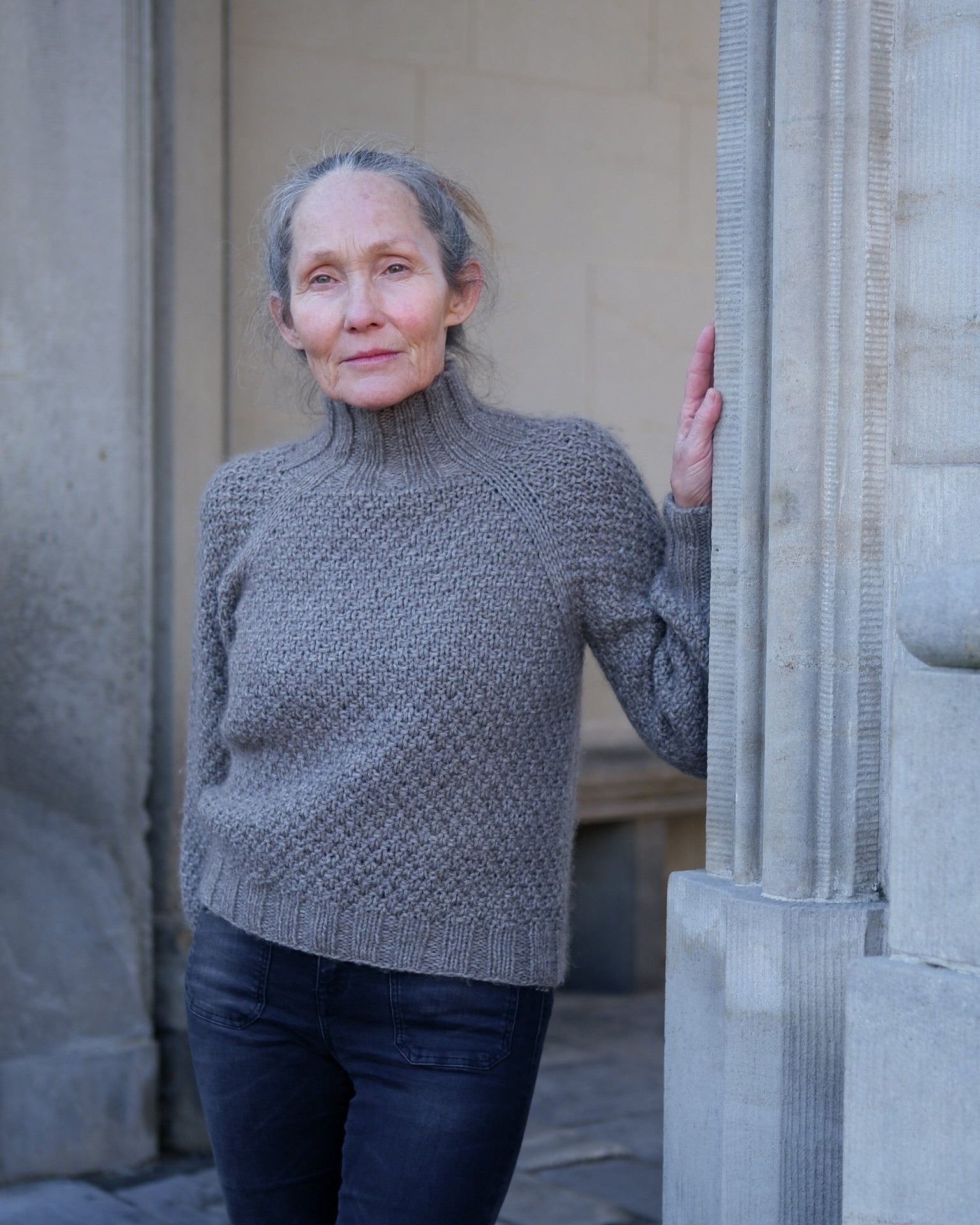 Le modèle présenté est tricoté en fil Heavy Merino de Knitting for Olive en couleur « Dusty Moose » et Soft Silk Mohair en couleur « Hazel ».