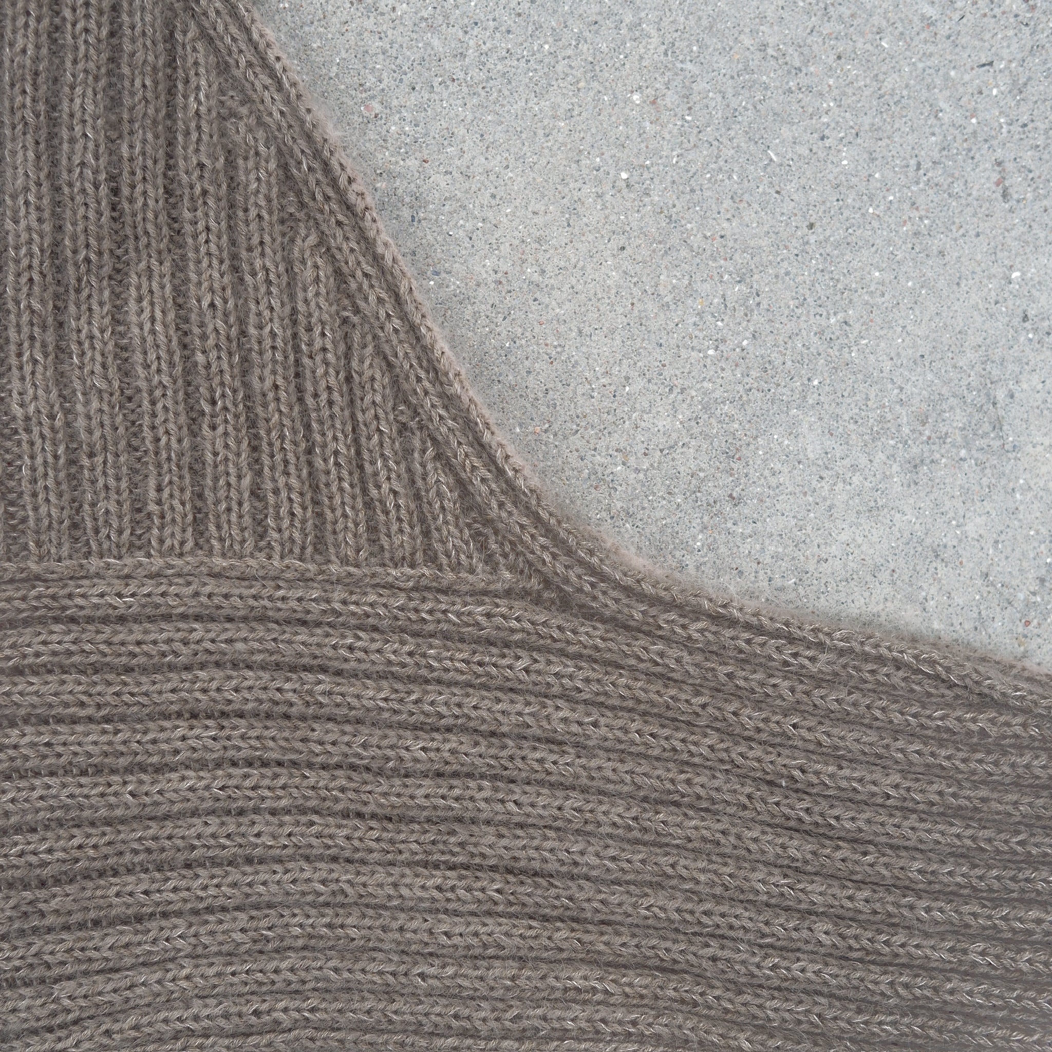 Garn: 1 tråd Knitting Knitting for Olive Merino (250 m [273 yd] / 50 g [1,8 oz]), fingertykt garn, 3 nøster + enten 1 tråd Knitting Knitting for Olive Soft Silk Mohair (225 m / 25 g), blondegarn, 3 nøster eller 1 tråd Knitting Knitting for Olive Compatible Cashmere (150 m / 25 g), blondegarn, 4 nøster. Prøven er i Merino i fargen Cardamom + Soft Silk Mohair i fargen Linen .