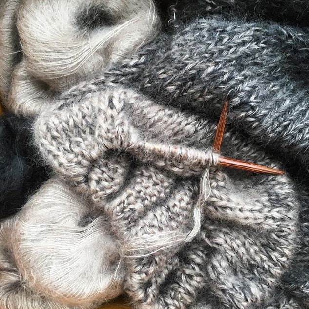 Prøven er i størrelse L, i Knitting Knitting for Olive Soft Silk Mohair, Midnight (farge 1) og Linen (farge 2)