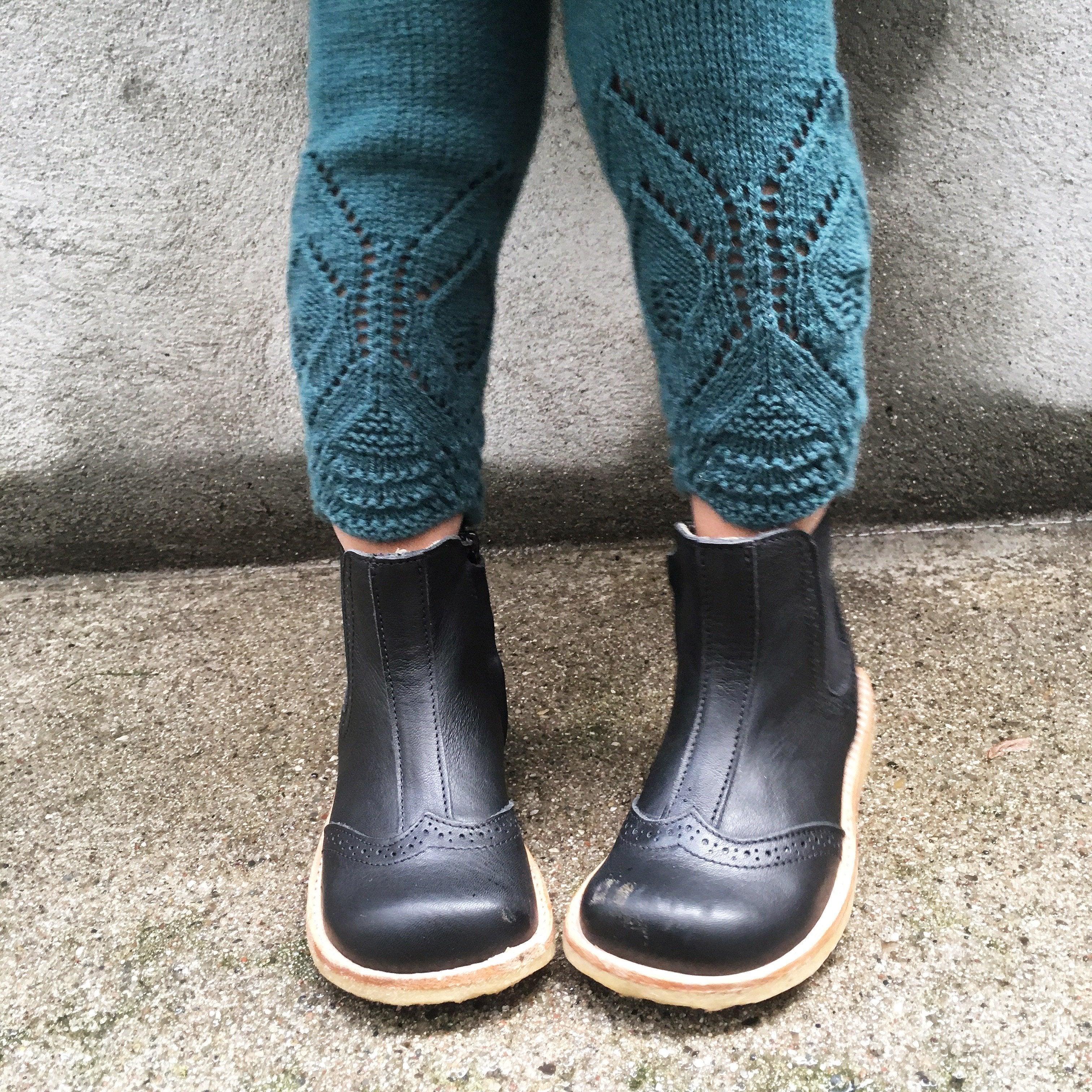 Lace Leggings er strikket sømløst rundt fra bunnen og opp. Korte pinner former ryggen, og et blondemotiv gjør glattstrikkingen mer interessant og gir helheten et attraktivt uttrykk. Linningen kan brettes ned til en kant med snøring for de mindre størrelsene, og en strikk for de større. Leggingsen er litt kort, slik at blondemotivet er synlig når barnet har på seg støvler, og det er angitt hvor man skal legge til lengde på de ferdige målene.