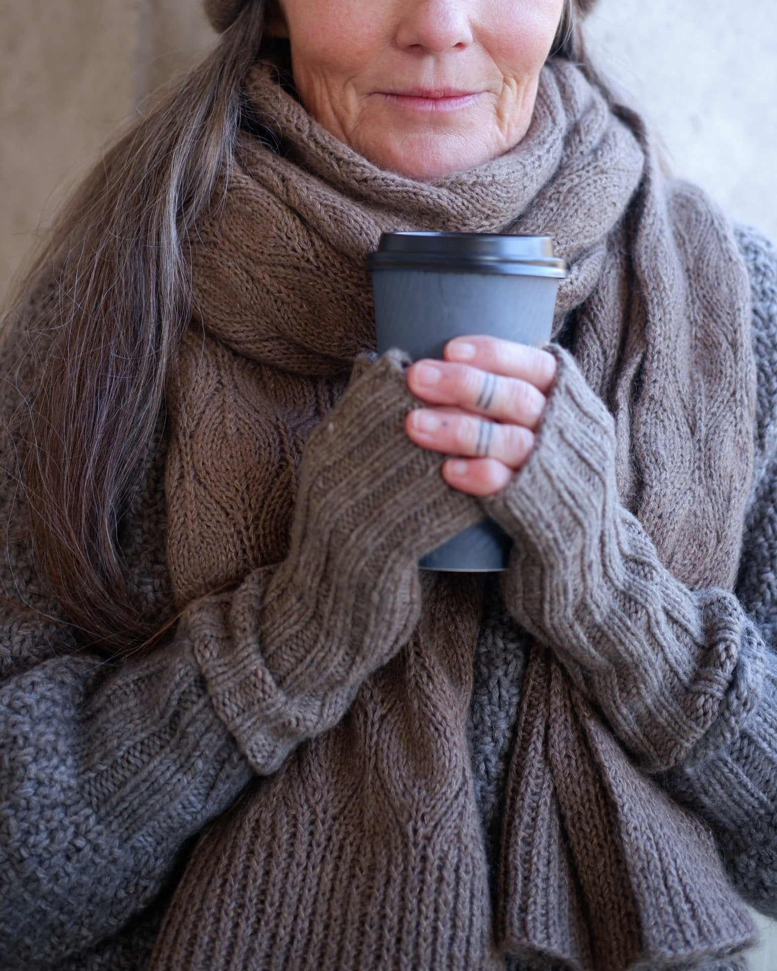 Olive Scarf er et langt, elegant skjerf strikket i et enkelt strukturmønster med vridde ribkanter. Skjerfet strikkes frem og tilbake. Det begynner og slutter med vridde ribber, og det strukturerte mønsteret strikkes etter et diagram.