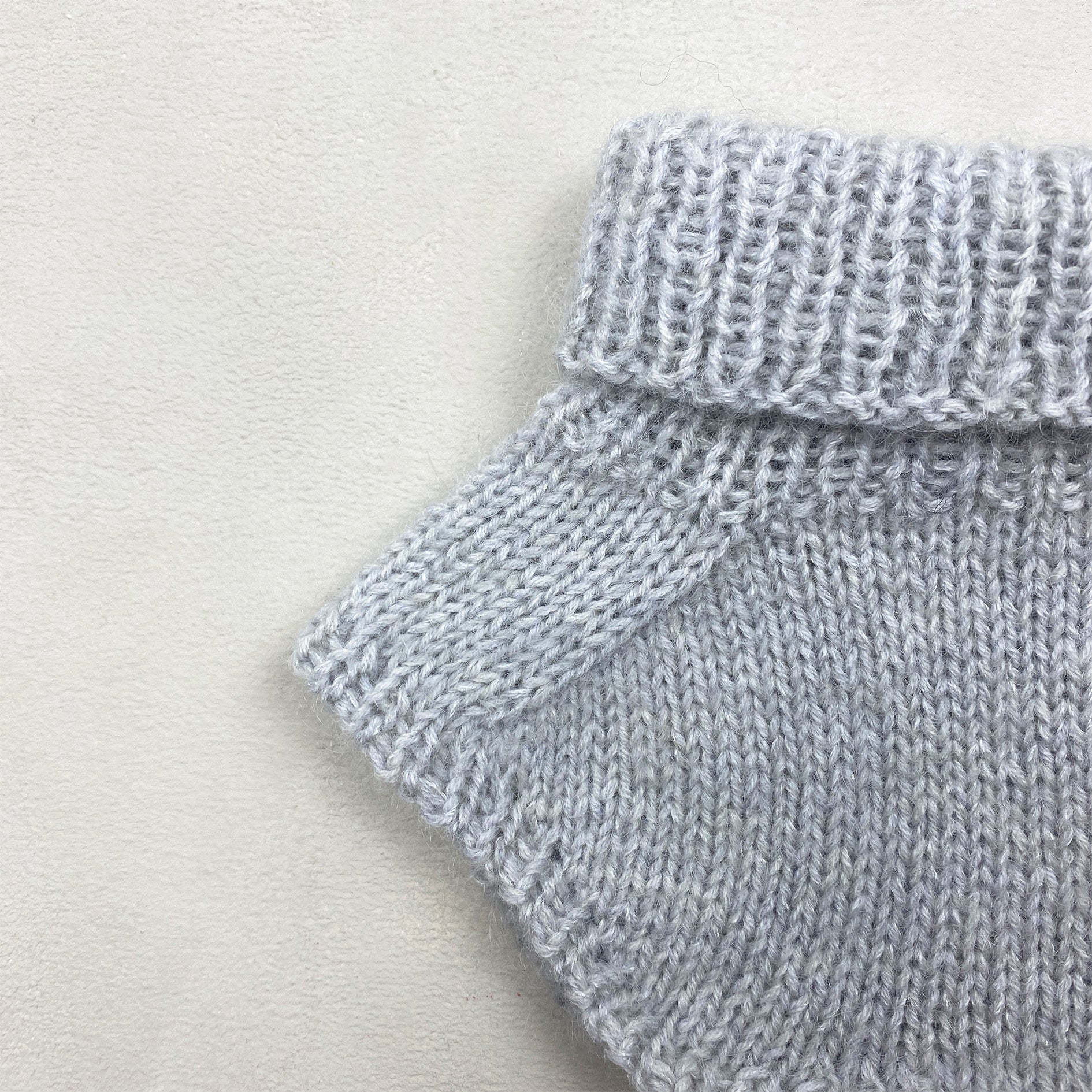 Garn: 1 tråd Knitting Knitting for Olive Merino (250 m [273 yd] / 50 g [1,8 oz]), fingertykt garn, enten 1 nøste eller ca. 12 (15) // 19 (24) g restgarn + 1 tråd av enten Knitting for Olive Soft Silk Mohair (225 m / 25 g), blondegarn, enten 1 nøste eller ca. 12 (15) // 19 (24) g restgarn eller Knitting for Knitting for Olive Compatible Cashmere (150 m / 25 g), blondegarn, enten 1 nøste eller ca. 12 (14) // 15 (18) g restgarn. Prøven er i merino+. Soft Silk Mohair i fargen Pearl Gray