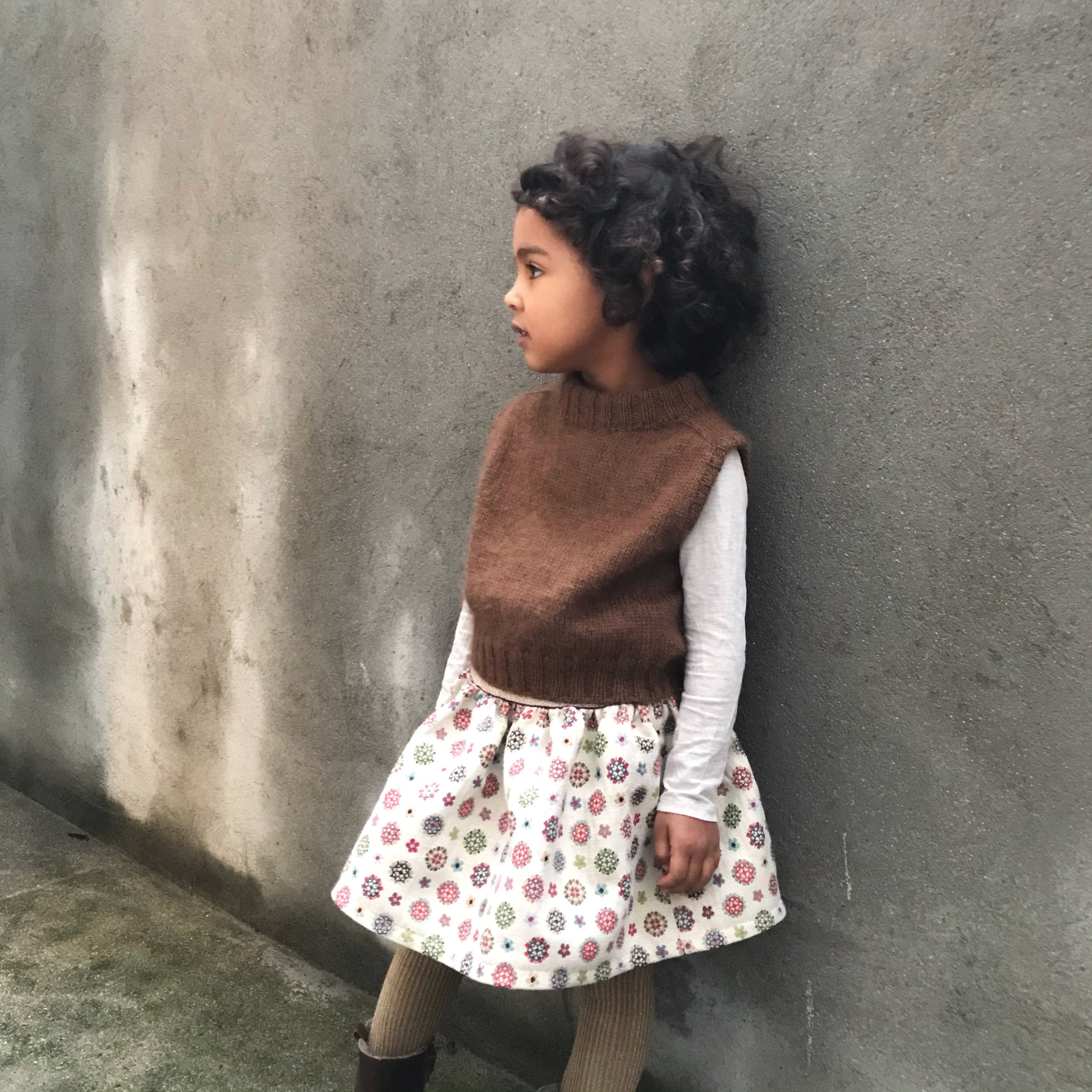 Olive's Vest er en klassisk og enkel slipover for barn strikket ovenfra og ned i glattstrikk med 1 tråd merino og 1 tråd Soft Silk Mohair. Du begynner med den brettede ribbestrikkede halskanten og fortsetter med å forme halsen med tyske vendepinner før du strikker hvert for- og bakstykke for seg ned til underarmene. Herfra fortsetter du rundt, før du avslutter kroppen med en ribbestrikket kant. Til slutt hekles det opp masker rundt ermehullene, og det avsluttes med en foldet ribbestrikket kant.