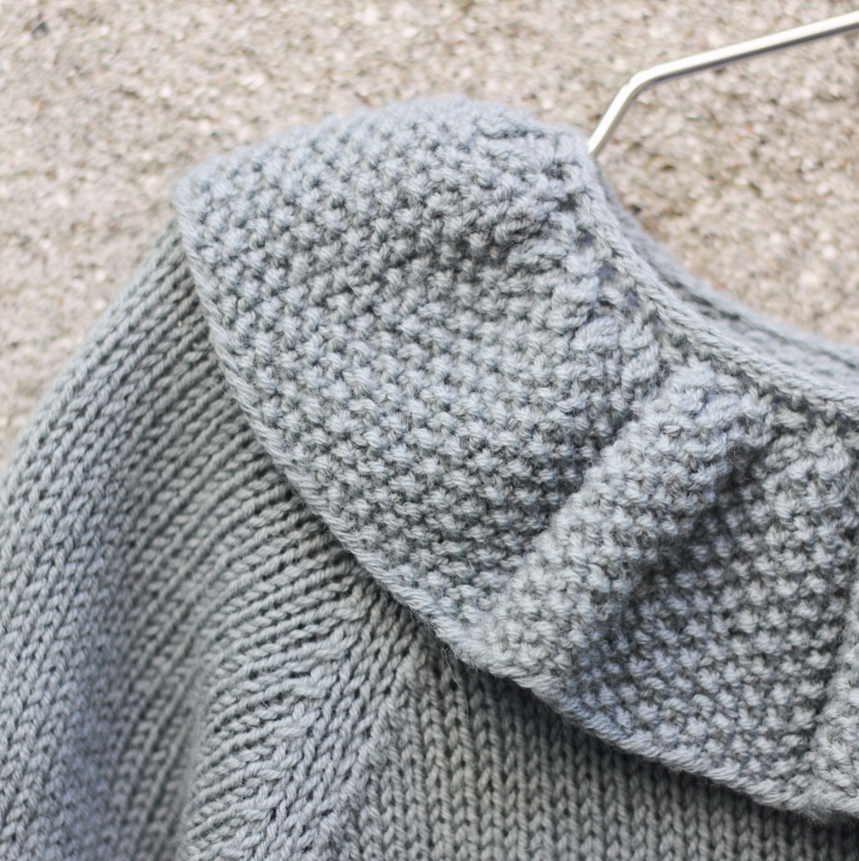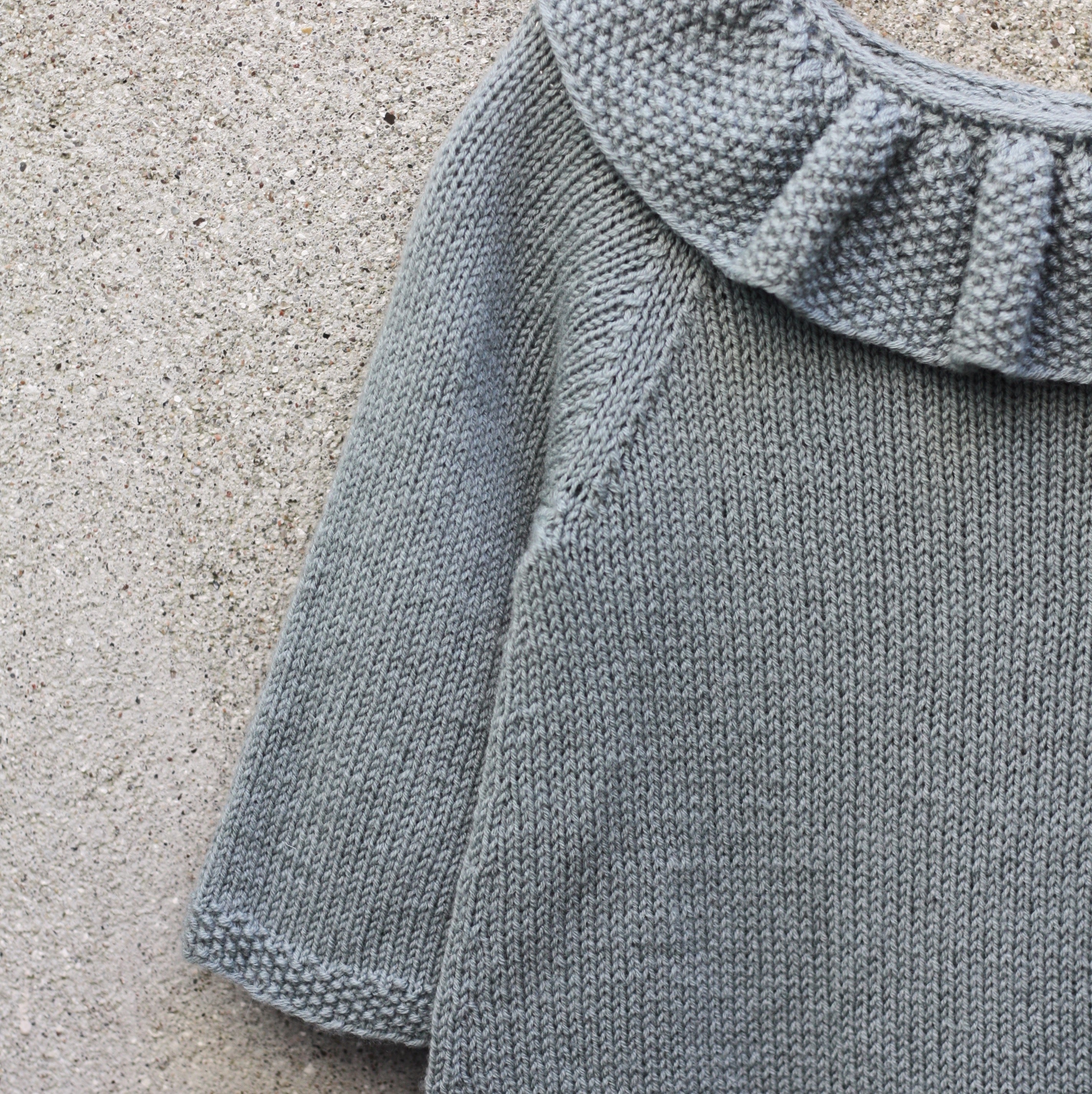 Den strikkes nedenfra og opp, og kragen strikkes separat og festes deretter ved å strikke den sammen med romperen.