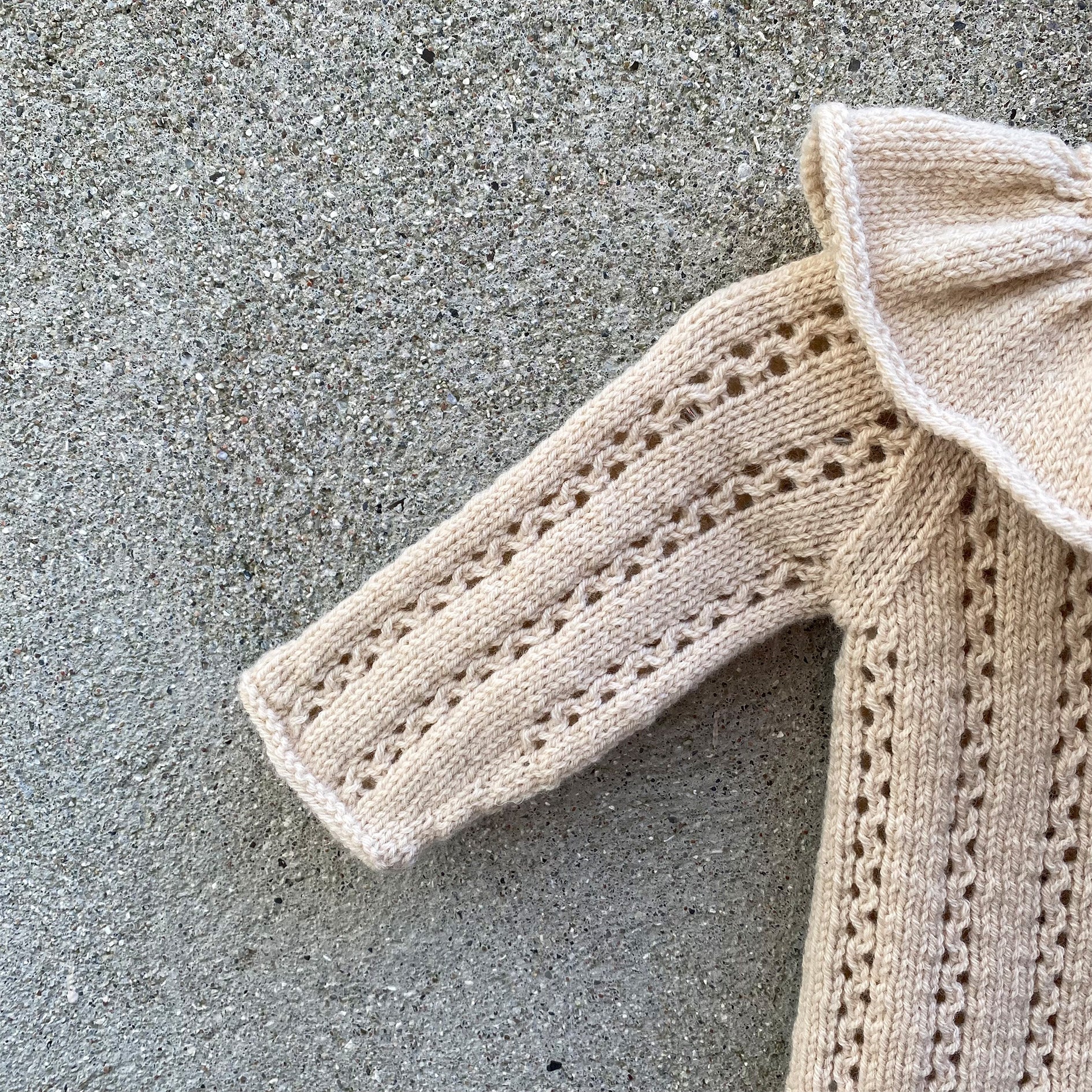 Rhubarb Wrap er en søt, liten slå-om-bluse med heldekkende hullmønster og volangkrage. Slå-om-designet gjør blusen enkel å ta på barnet, og en ekstra knapp på innsiden holder det indre frontstykket på plass.