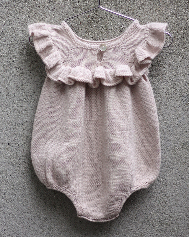 Ruffle Romper er en enkel romper med en dekorativ volang på bærestykket. Den strikkes ovenfra og ned i glattstrikk med 1 tråd Merino, Cotton Merino eller Pure Silk. Romperen kan strikkes med eller uten ermer - en Merino-versjon med ermer til høst og vinter, og en Cotton Merino Merino- eller Pure Silk -versjon uten ermer til for eksempel vår og sommer, vil være nydelig.