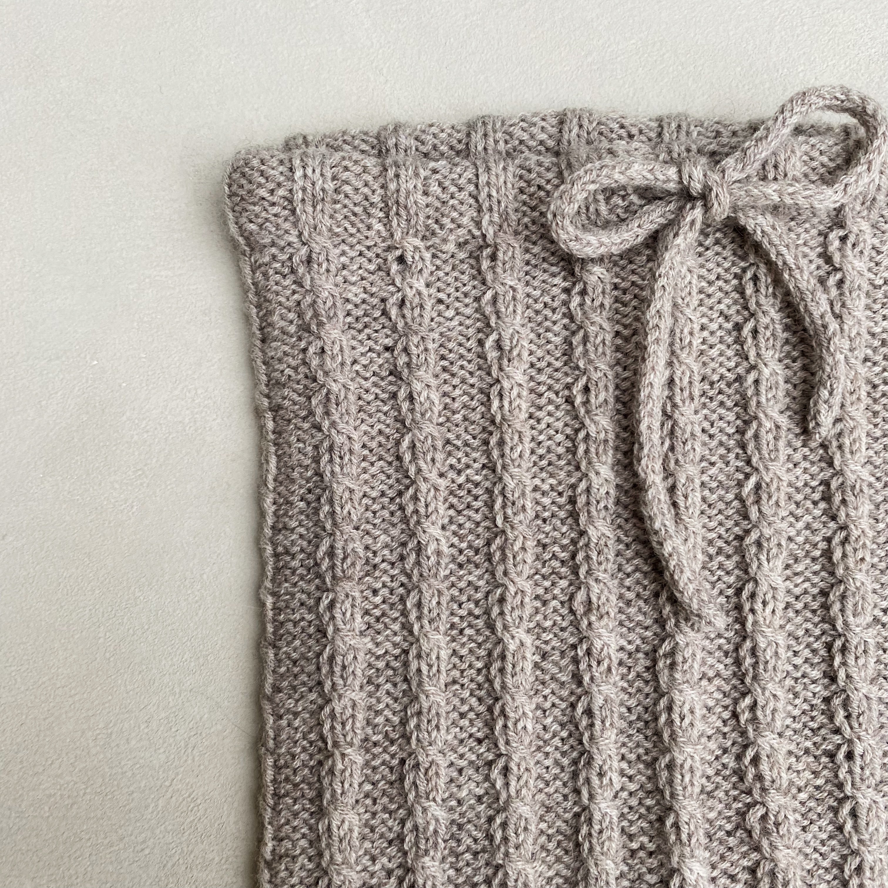 Cable Tights strikkes rundt ovenfra og ned og formes bak med korte pinner for å få plass til bleien. Arbeidet deles i skrittet og hvert ben strikkes ferdig for seg, enten med strømpepinner eller med Magic Loop-metoden. Hælen er en såkalt ettertankehæl, der hælmaskene først strikkes på et ekstra stykke garn og deretter plukkes opp igjen og hælen strikkes ferdig etter at resten av foten er ferdig. En i-cord-snøring settes inn i snøringskanalen i midjen, eller erstattes av en 1 cm bred strikk. Strømpebuksen strikkes med 1 tråd Merino eller Cotton Merino.