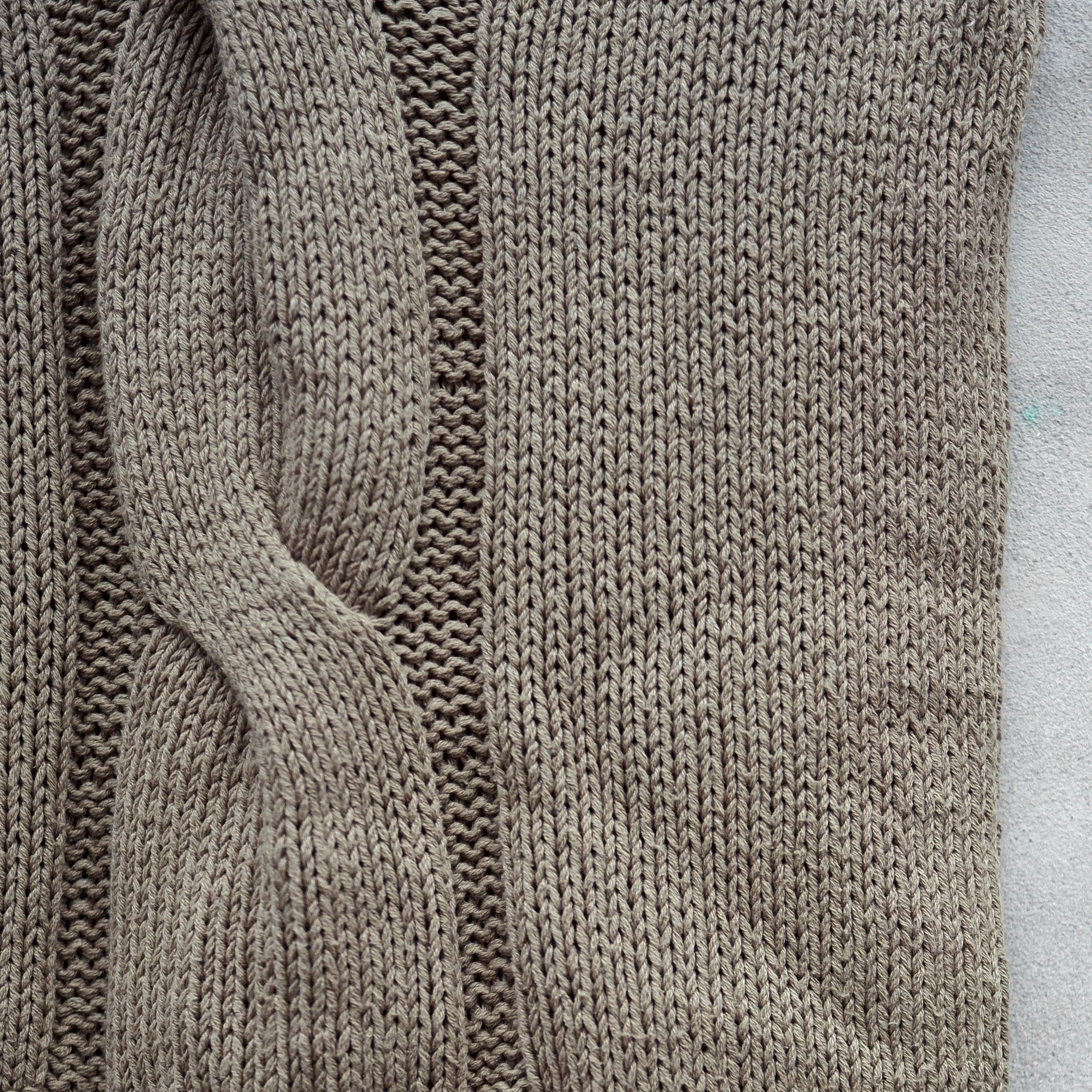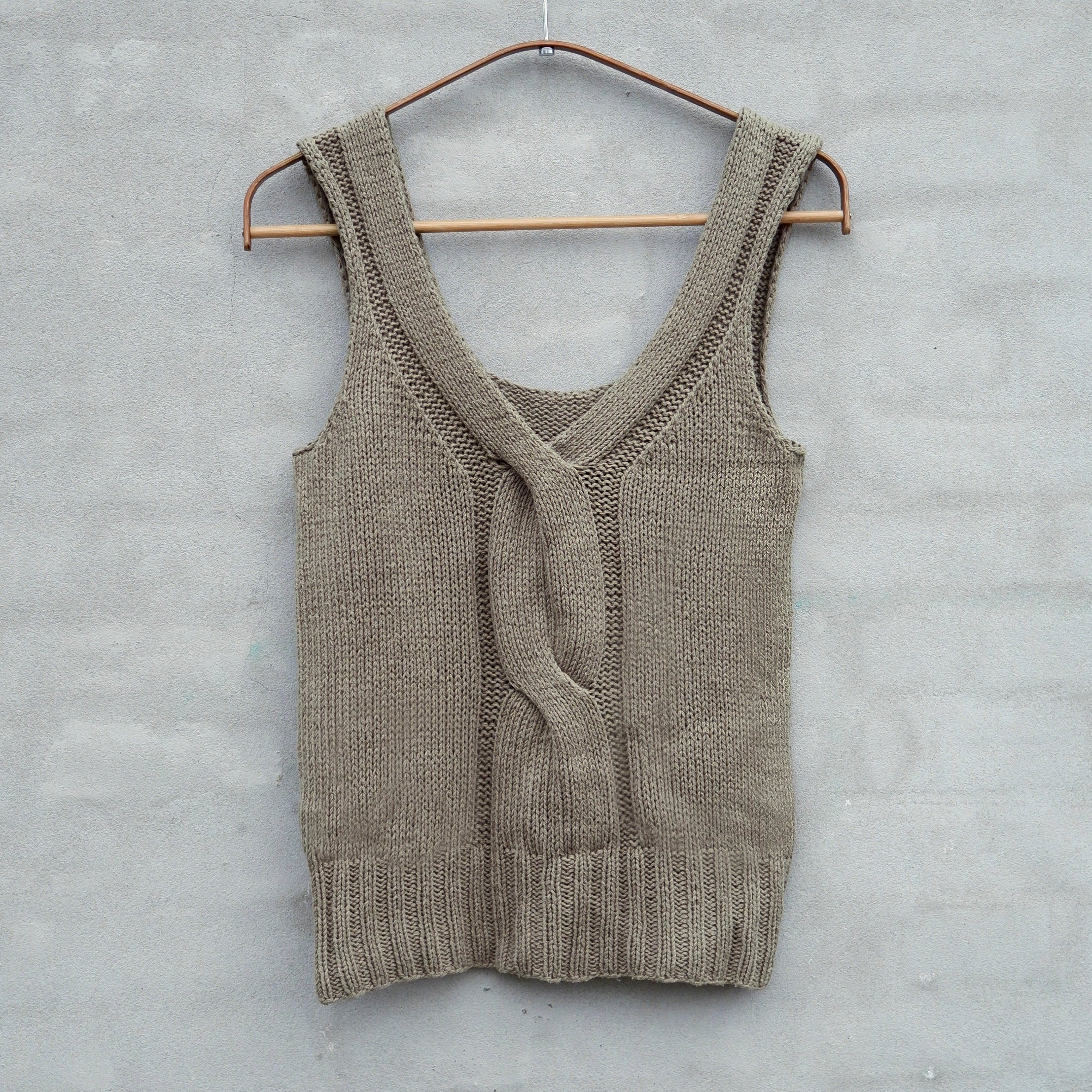 Twisted V-top er en moderne versjon av en sommertopp, med en klassisk, sentrert flette som deles i to deler på forsiden for å skape V-hals og stropper. Twisted V-top er strikket med 2 tråder av Pure Silk som holdes sammen hele veien. Kroppen strikkes nedenfra og opp rundt til armhulene. Her deles arbeidet, og for- og bakstykket strikkes ferdig hver for seg frem og tilbake.
