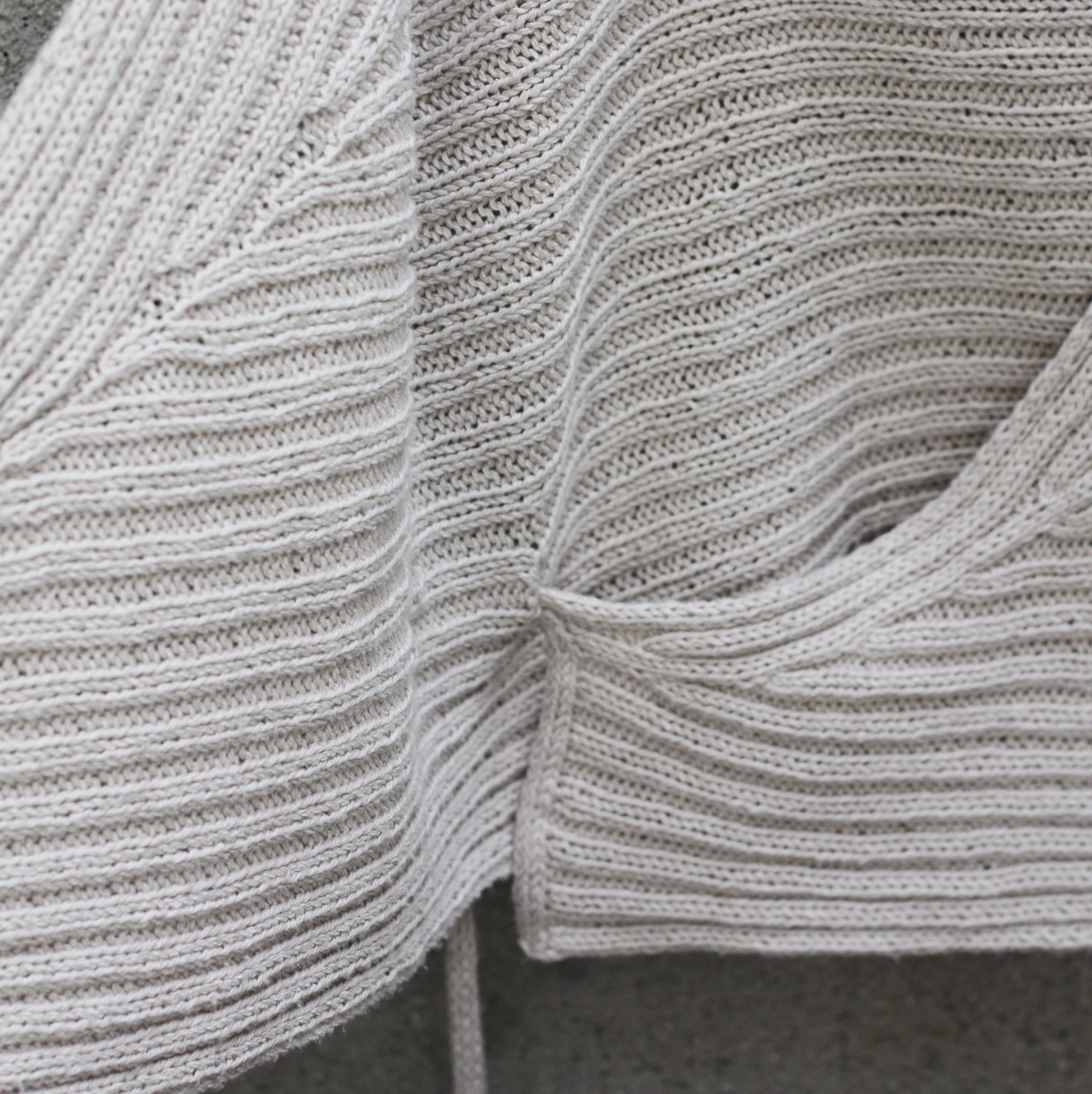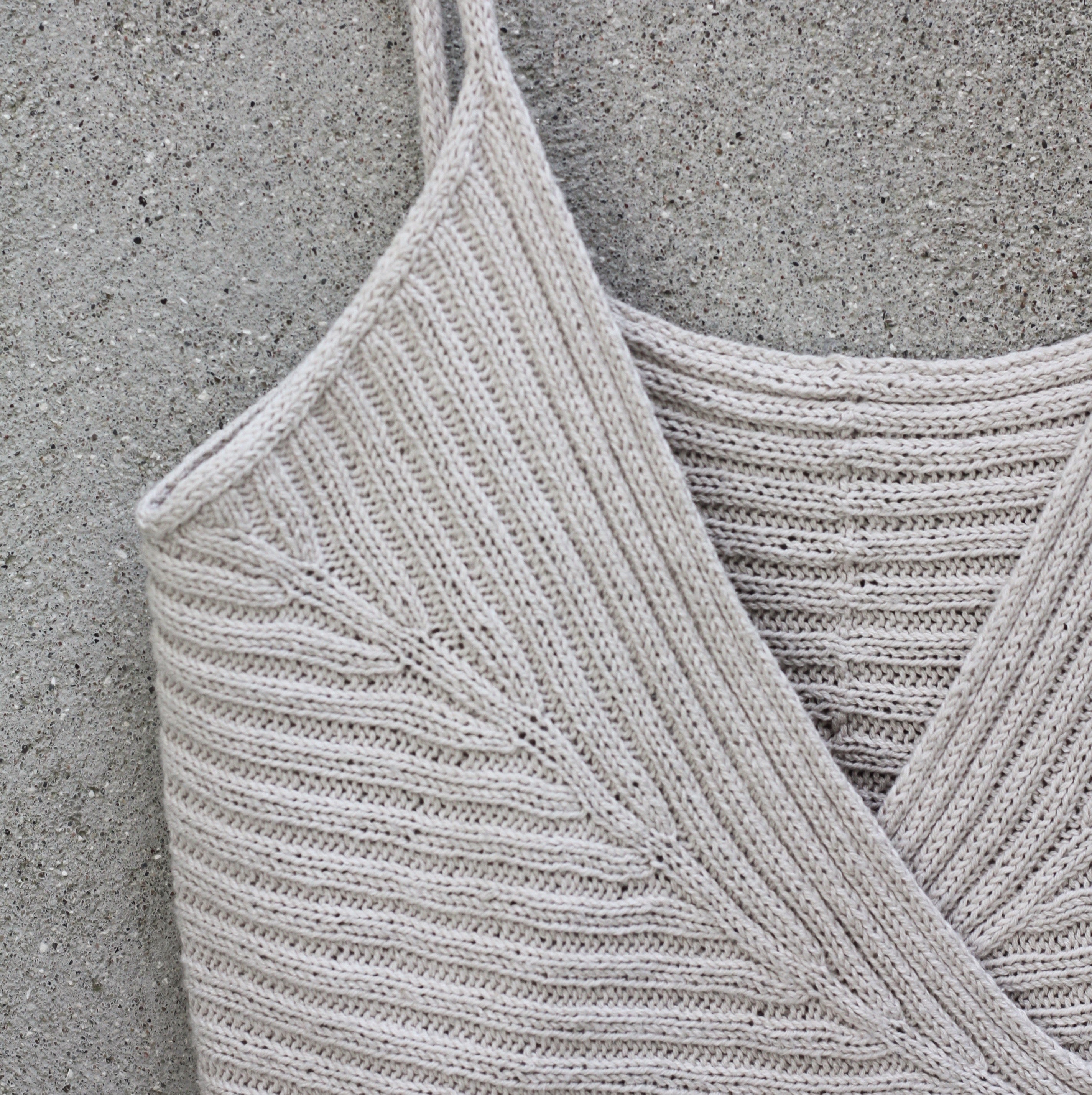 Yoko Top er en omlottopp med en sideveis konstruksjon i ribbestrikkmønster som skaper et grafisk designelement. Den strikkes flatstrikket i to separate, omvendte deler som begynner foran og deretter sys sammen midt bak. Toppen har skulderstropper med I-snorer og bånd i midjen, og er avsluttet med I-snorkanter. Den er kort og har en dyp silhuett foran, og du kan bruke den som et lag-på-lag-plagg eller som en sommertopp.