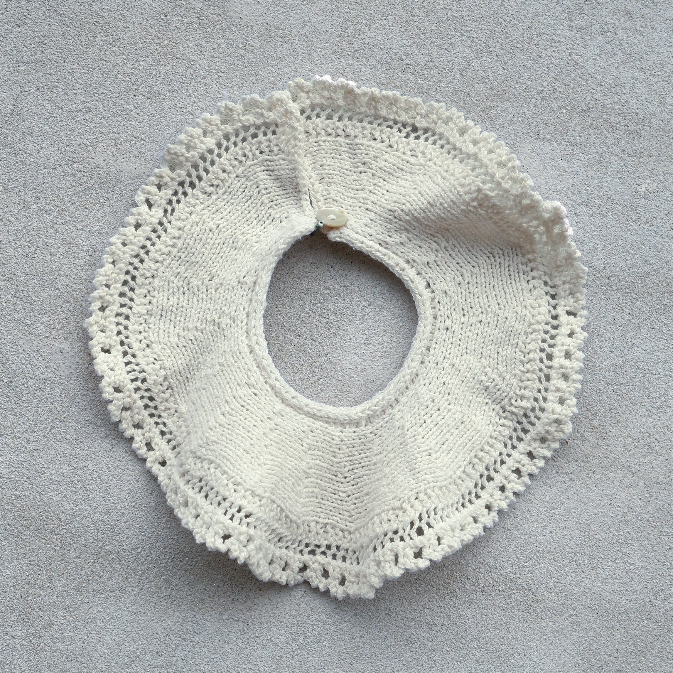 De kraag wordt zowel heen en weer als zijwaarts gewerkt en wordt gevormd met korte rijen. Het oogjespatroon is een herhaling van 16 rijen en je kunt de omtrek gemakkelijk vergroten door extra herhalingen te maken. De kraag wordt afgewerkt door een knoopsgatenlus te haken en 1 knoop te bevestigen.