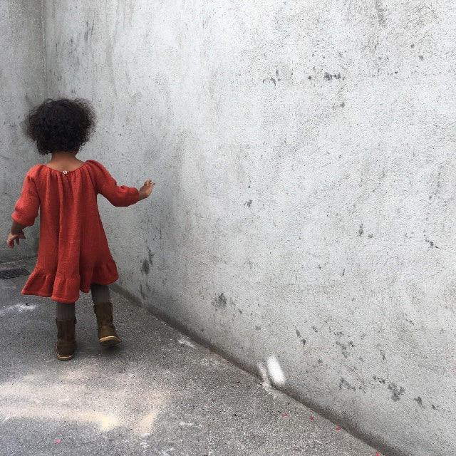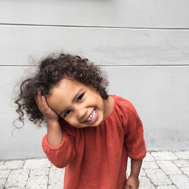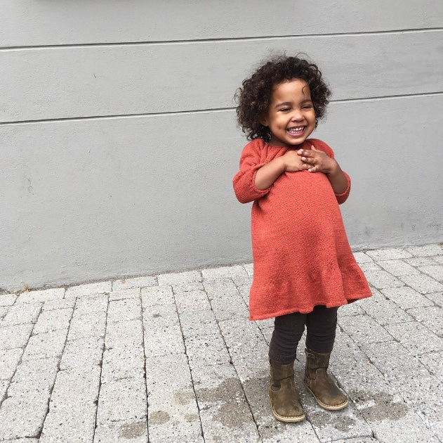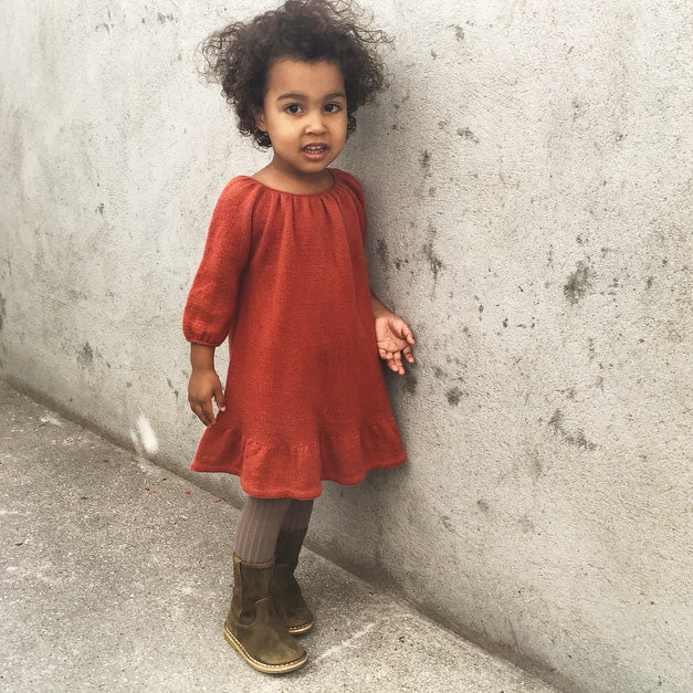 Augusta Dress is een eenvoudige jurk in tricotsteek met 3/4 mouwen, een gerimpeld juk en een ruche langs de onderrand. De losse pasvorm van de jurk geeft het kind genoeg ruimte om te spelen en te bewegen. Het is naadloos van boven naar beneden gewerkt met 1 draad Merino, Cotton Merino of Pure Silk.
