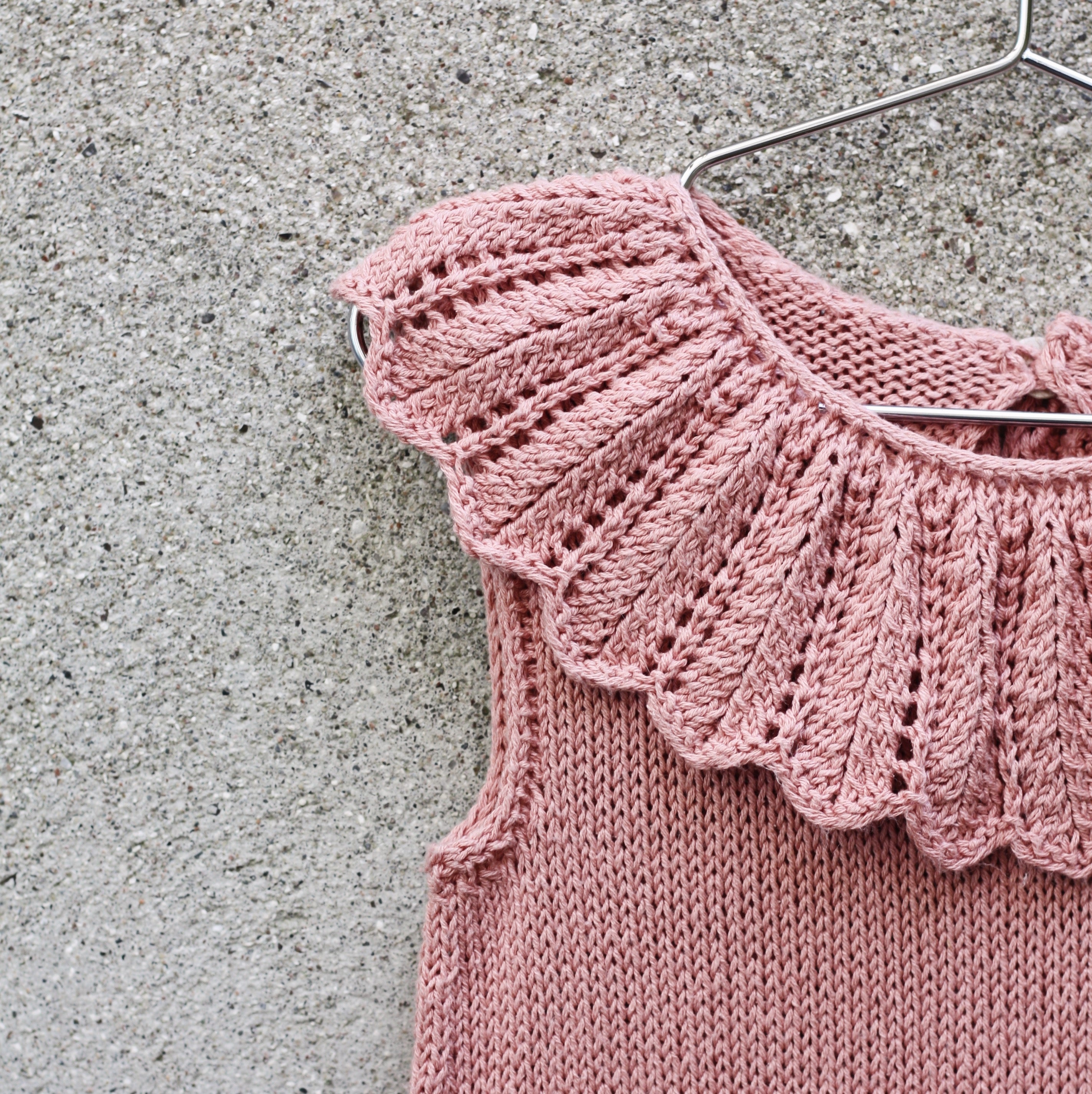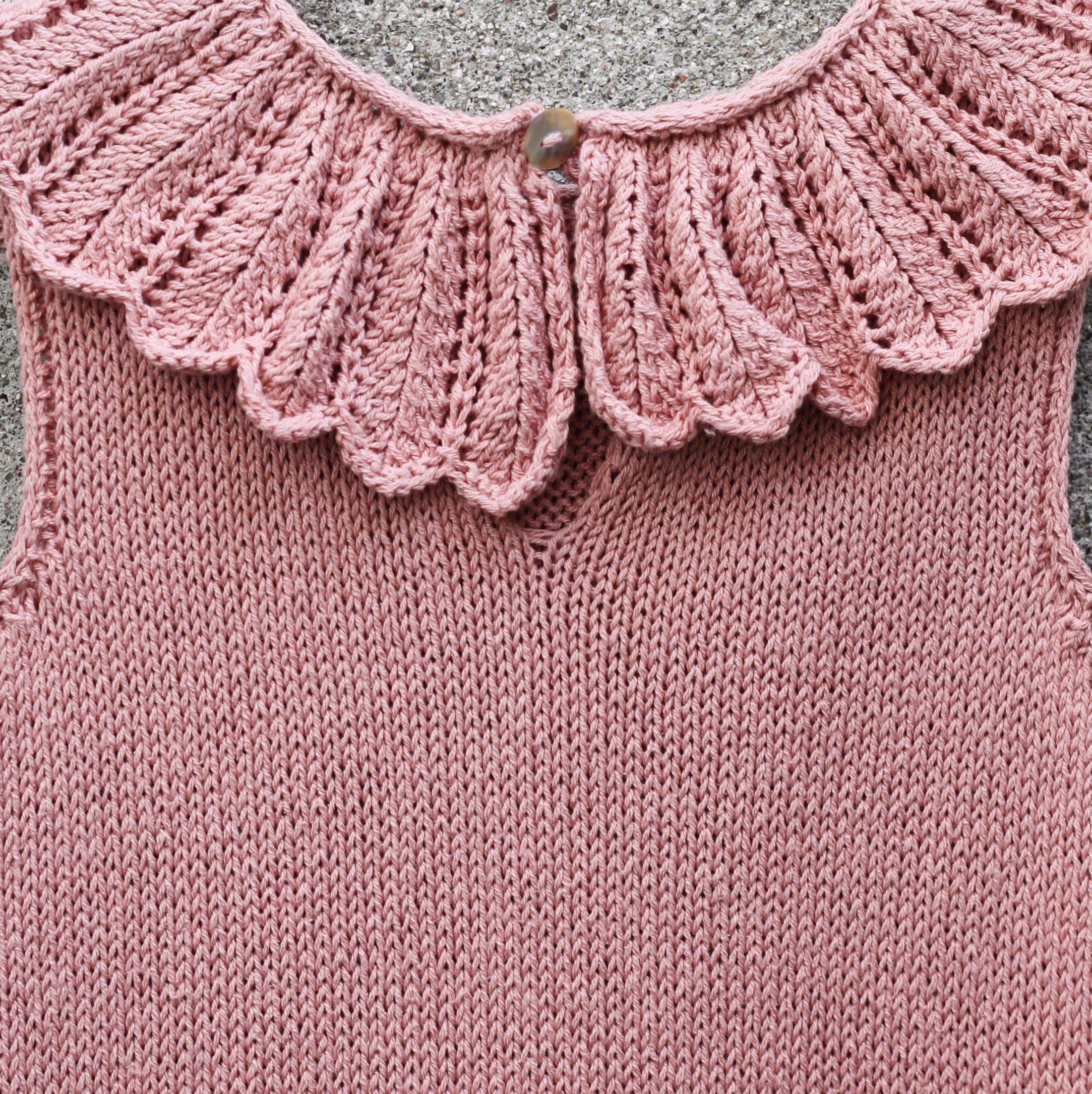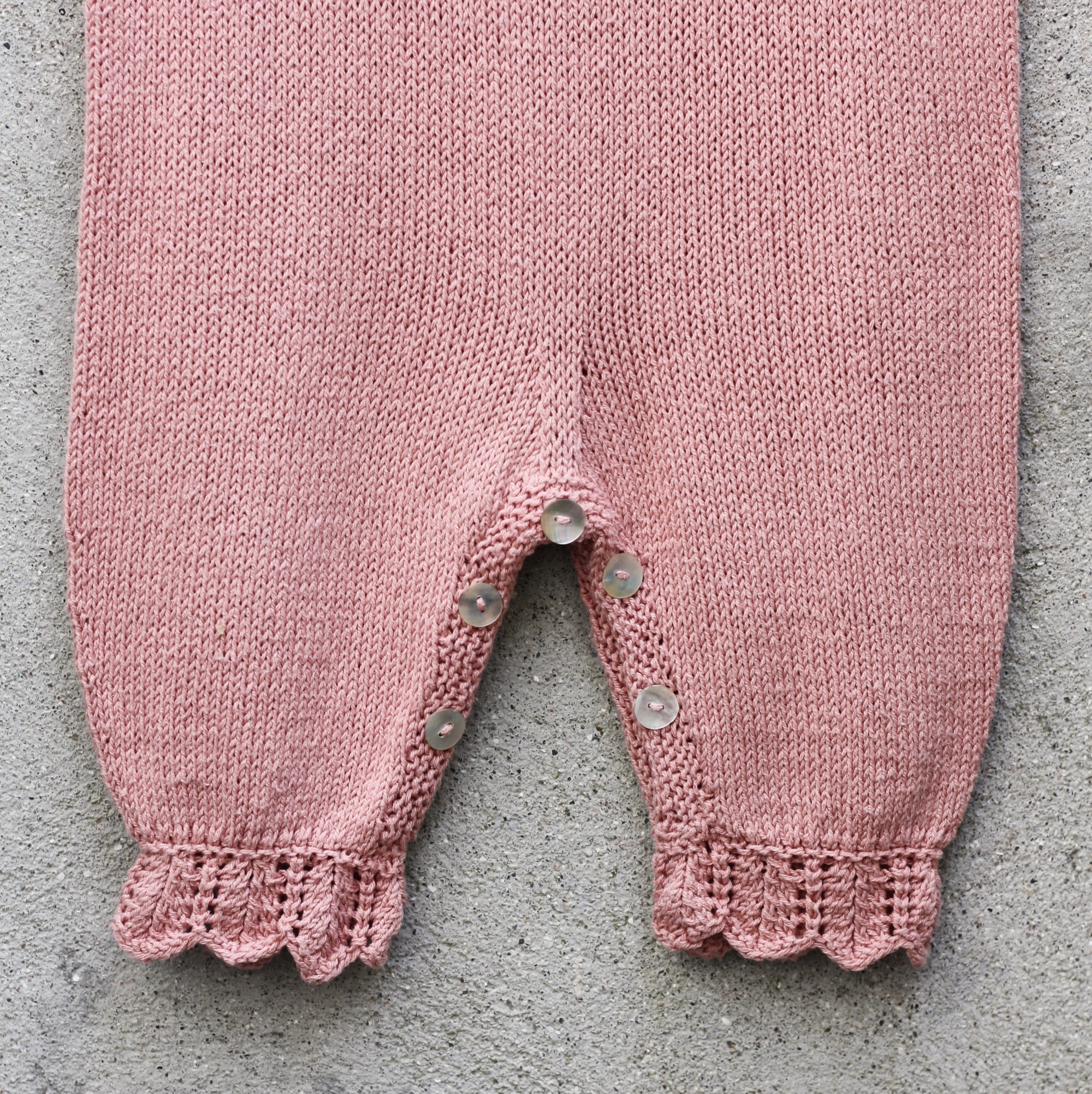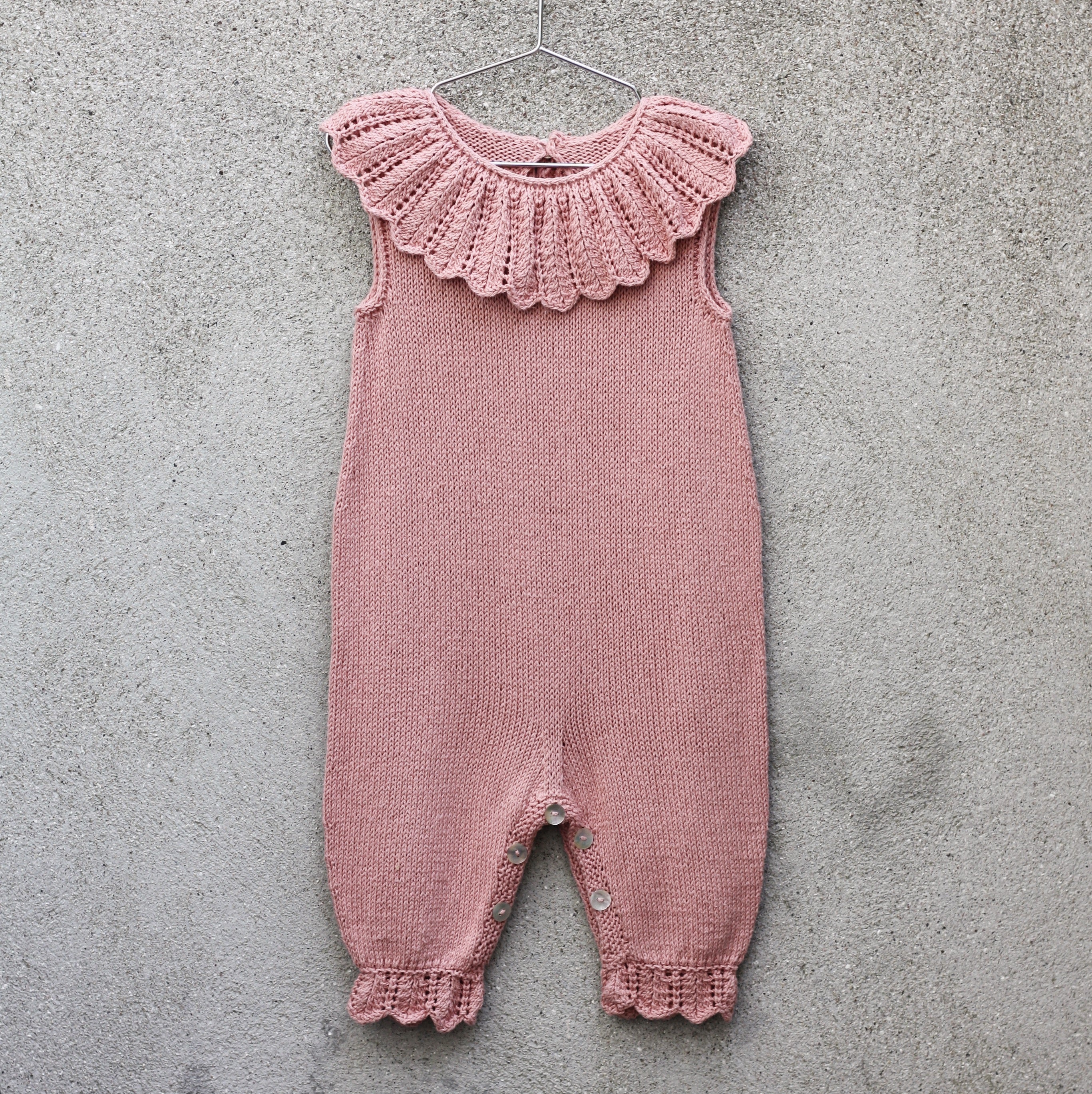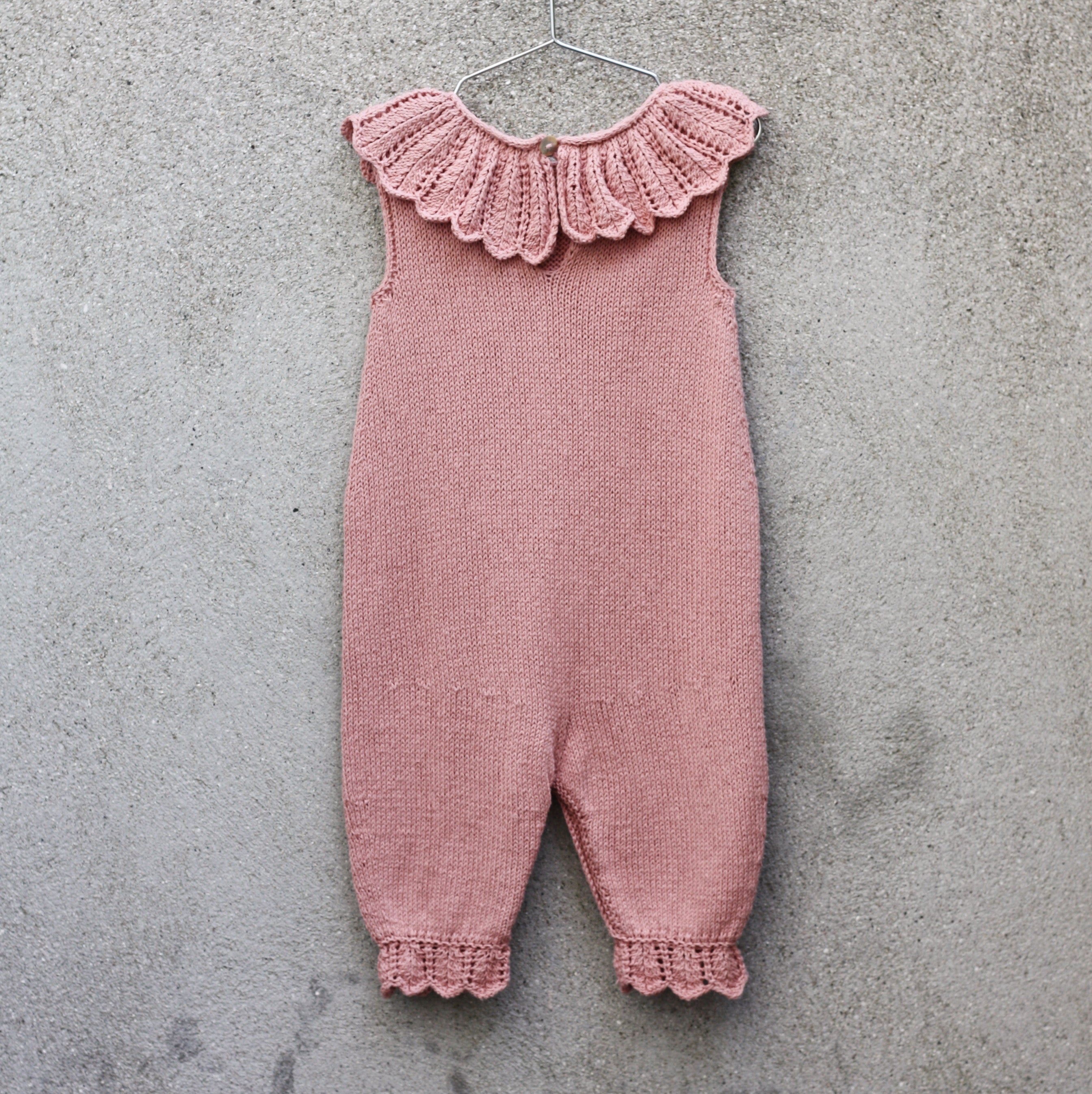 De Daisy jumpsuit zal je baby verfraaien in de eerste maanden van zijn leven. De jumpsuit is verkrijgbaar in vier maten, van 3 tot 24 maanden, en is ontworpen om het dragen en verschonen van luiers te vergemakkelijken, terwijl die kostbare eerste maanden versierd worden met kanten madeliefjesblaadjes. Onze mouwloze Daisy jumpsuit is van onder naar boven gebreid in een combinatie van heen-en-weer en in-de-ronde breiwerk en heeft een brede luieropening van enkel tot enkel en een korte ruglijn die ruimte biedt voor luiers. De achterkant heeft een opening die in de nek wordt gesloten met een gehaakte knooplus. De manchetten zijn afgezet met kanten randjes. De brede kanten kraag met madeliefjesblaadjes wordt apart heen en weer gebreid en dan rond de halslijn vastgemaakt. De madeliefjeskantsteekpatronen zijn uitgeschreven.
