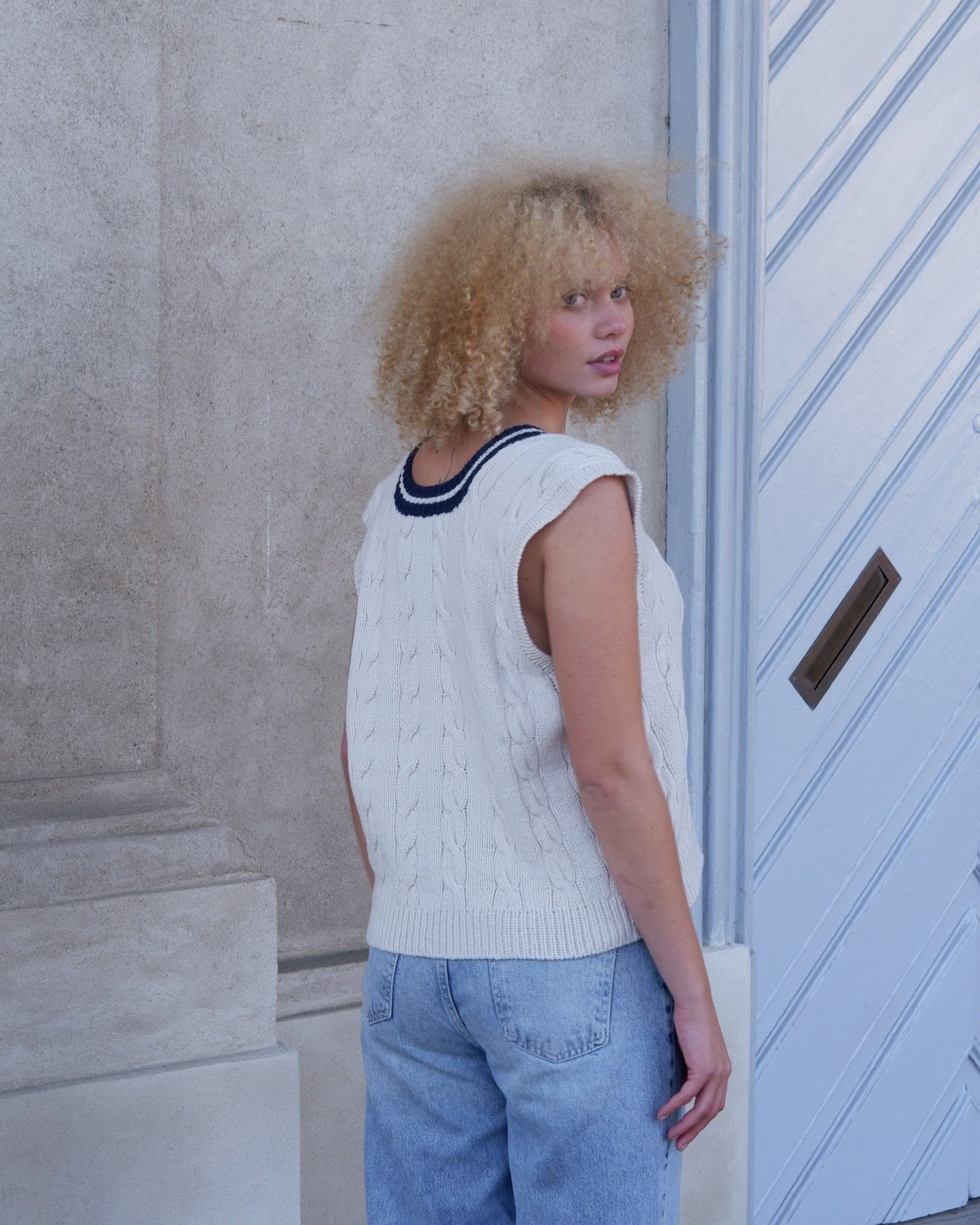 Eton Slipover is een klassiek gekabeld "cricketvest" met een V-hals. Het vest wordt gewerkt vanaf het patroon en vanaf de bovenkant naar beneden met 2 strengen Merino die bij elkaar worden gehouden. Je begint met het apart heen en weer werken van het achterpand en het voorpand voordat je het werk samenvoegt bij de oksels. Het lijfje wordt in de ronde afgewerkt met een geribde zoom voordat de steken voor de armopeningen en de halsband worden opgenomen. Armopeningen en de tweekleurige halsband zijn beide afgewerkt in ribbelsteek.