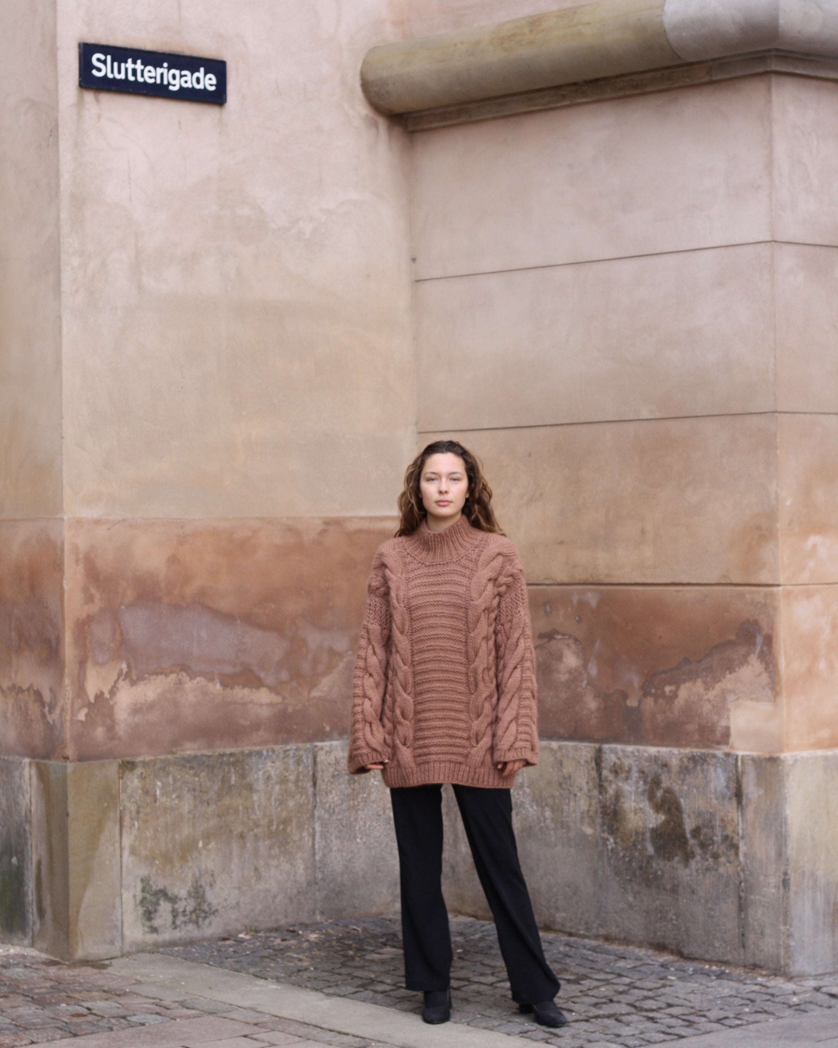 Knitted Streets of Copenhagen is een oversized trui geïnspireerd op de smalle en kronkelige straatjes van het oude Kopenhagen. Deze grote en dikke trui laat zowel rondingen als rechte lijnen zien, en is tegelijkertijd casual en geraffineerd - net zoals Kopenhagen voor ons is. De trui is erg oversized met extralange mouwen, maar de mouwen kunnen gemakkelijk korter worden gemaakt als dat je voorkeur heeft.