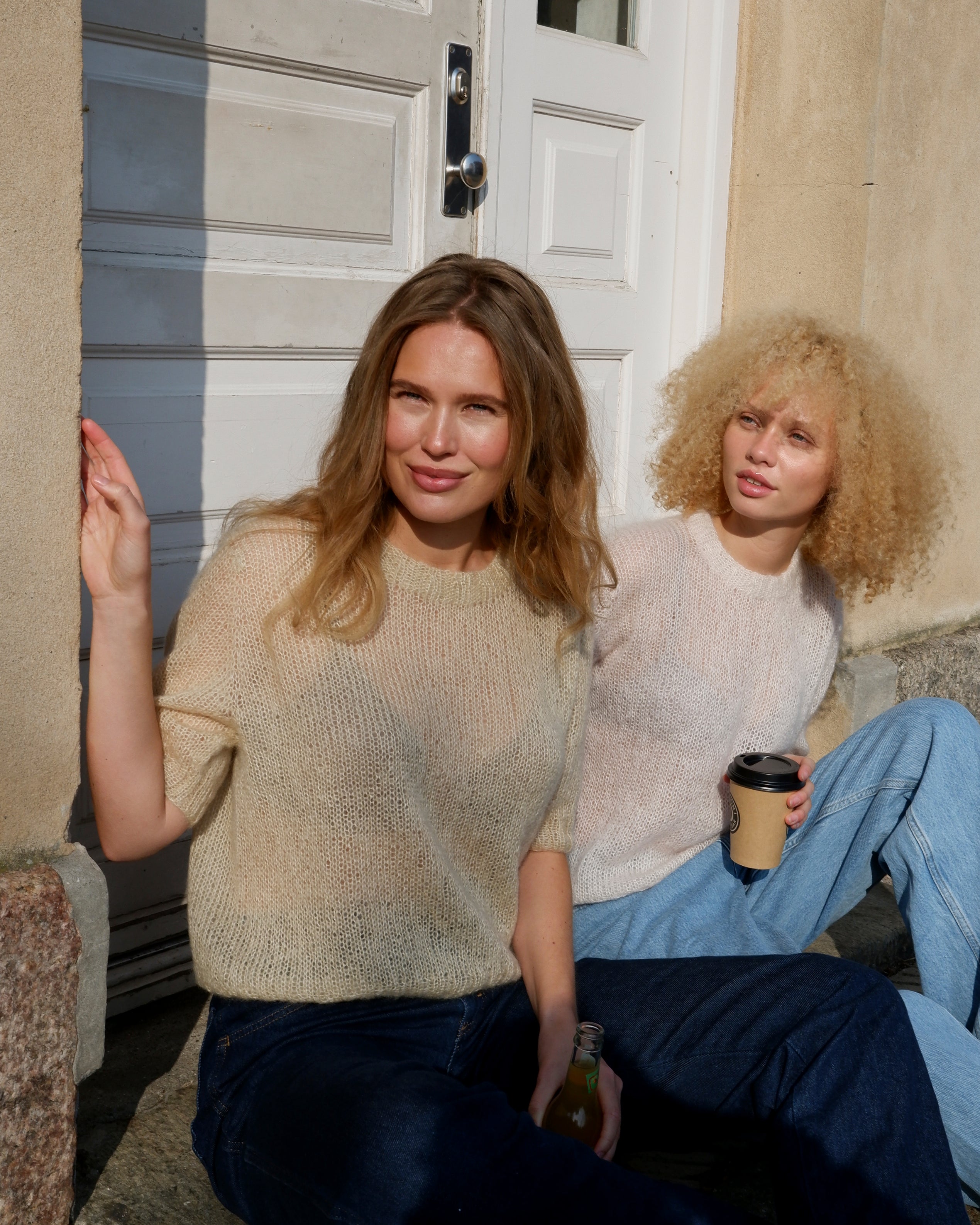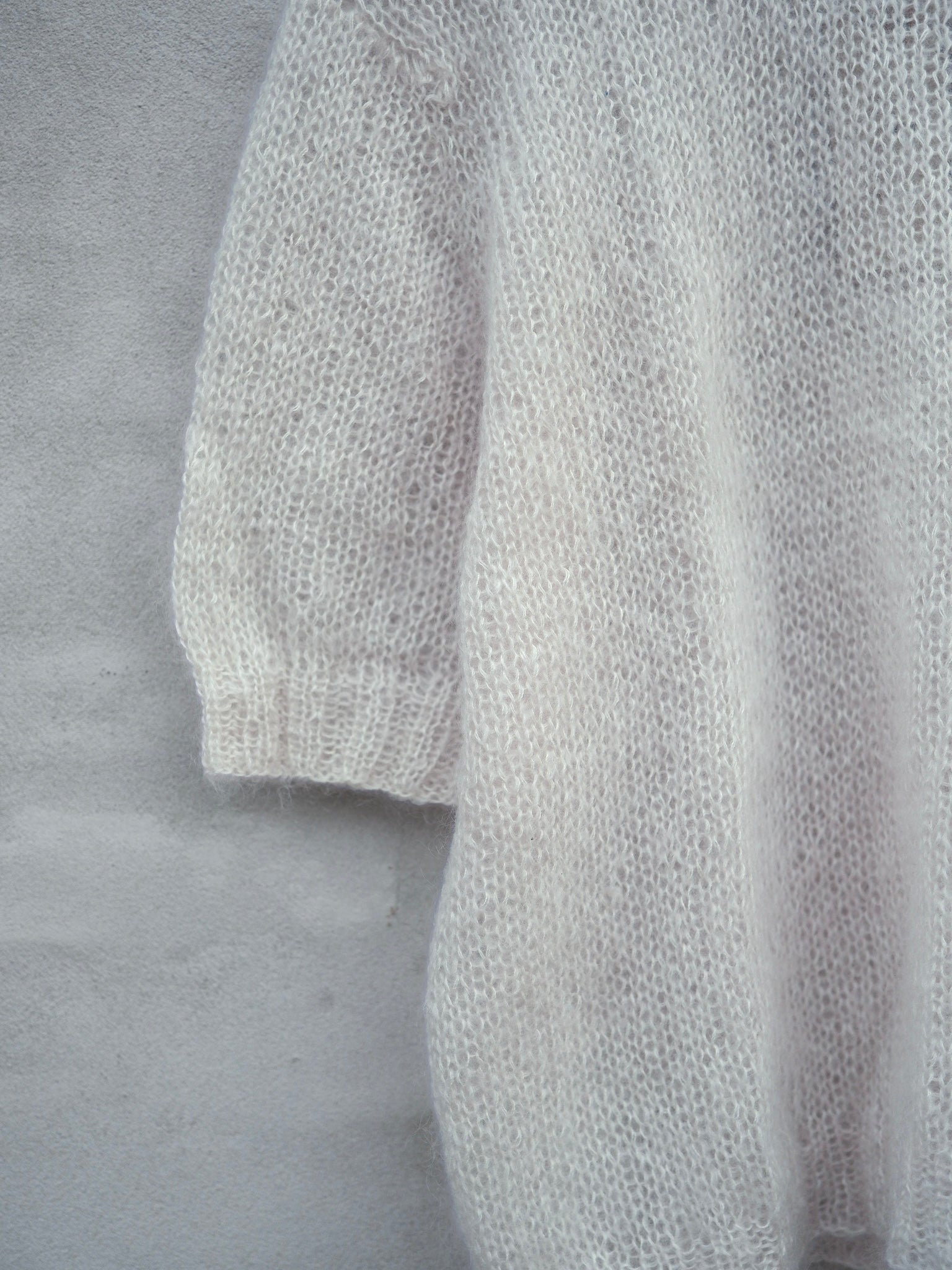 Mollie Tee is een eenvoudig top-down T-shirt met een elegante schouderconstructie. Het is gemaakt van 2 strengen zacht zijde-mohair die bij elkaar worden gehouden.