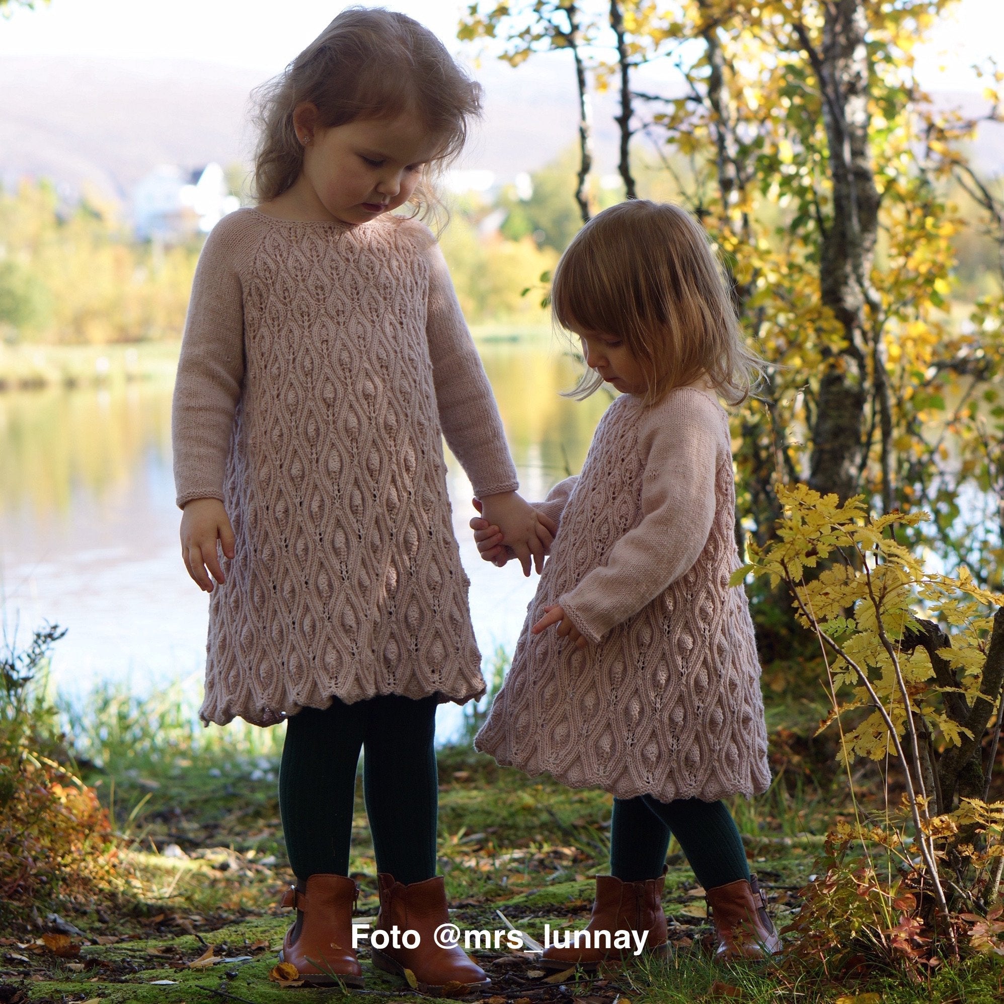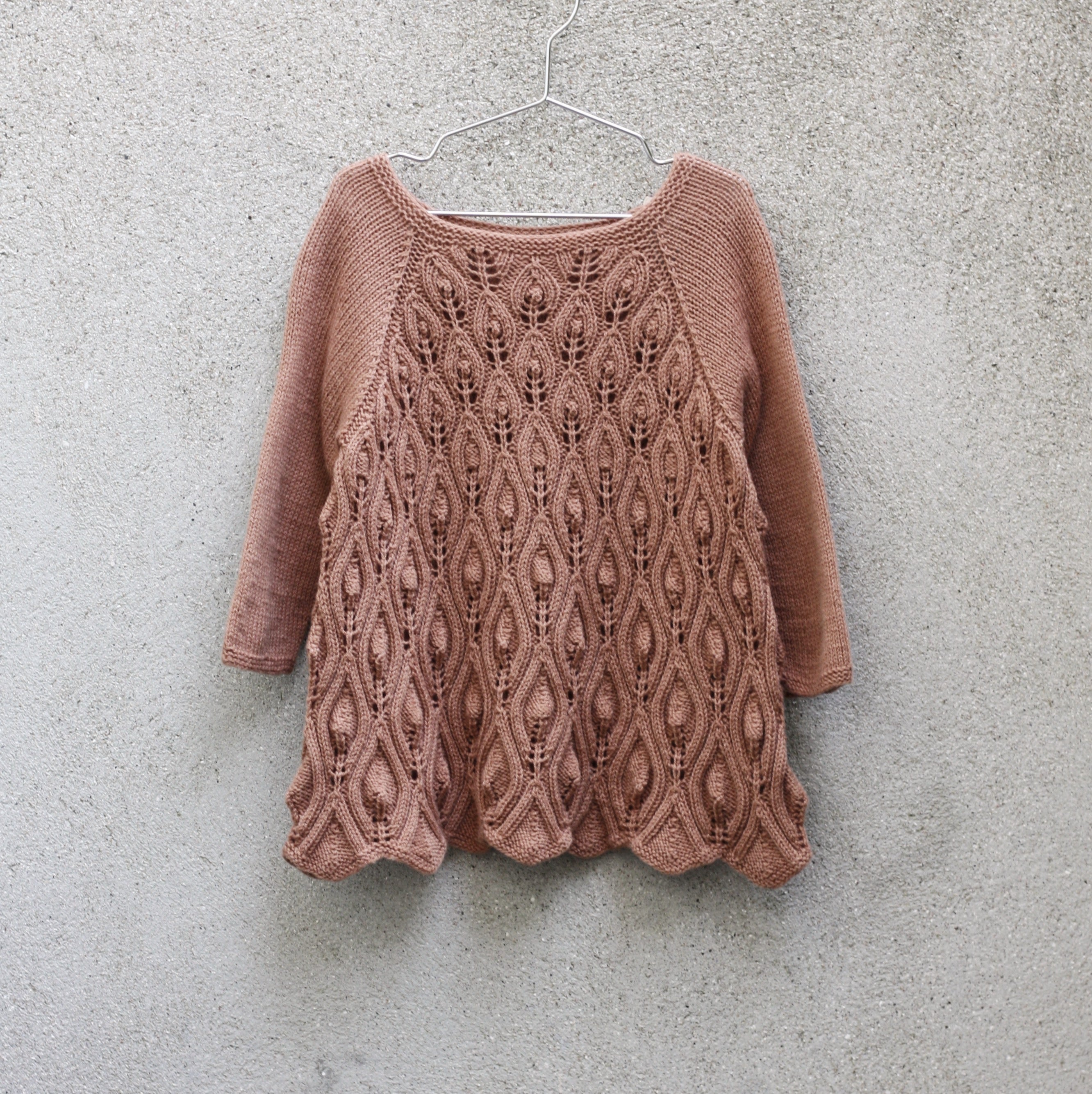 De Peacock dress is rondgebreid van onder naar boven met een raglanvorm.