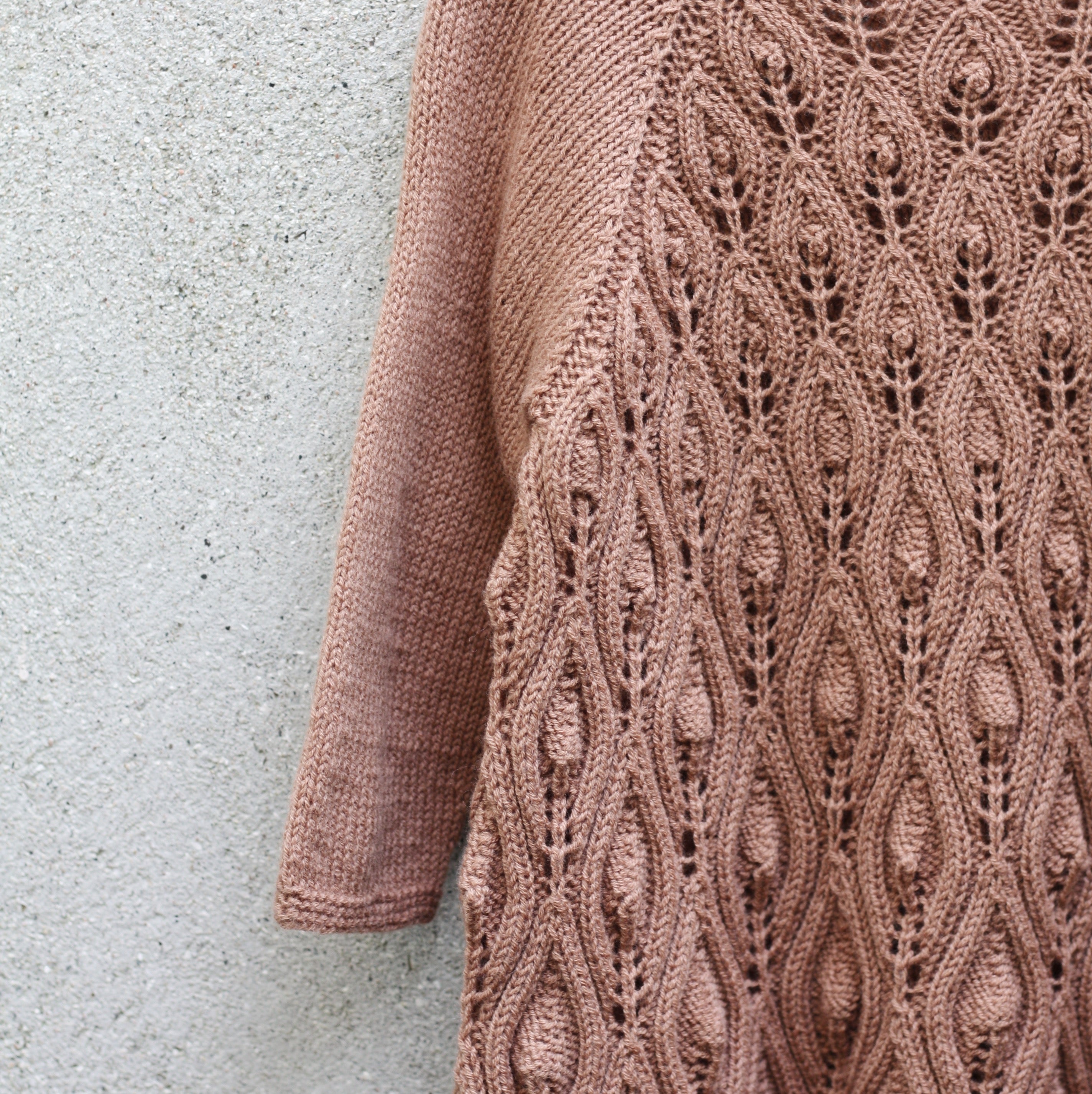 De mouwen zijn rondgebreid in tricotsteek en worden onder de arm aan de kanten rok vastgemaakt.