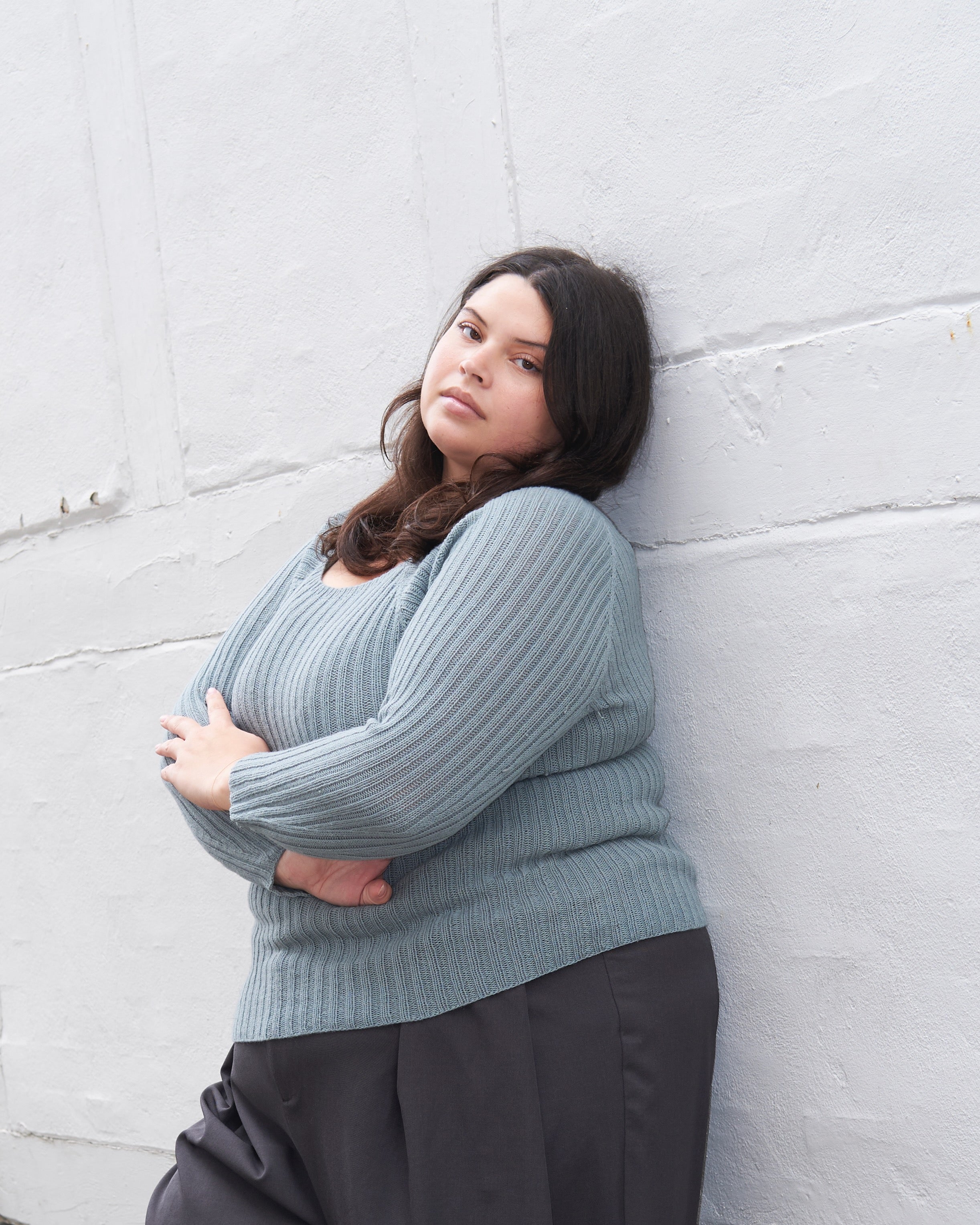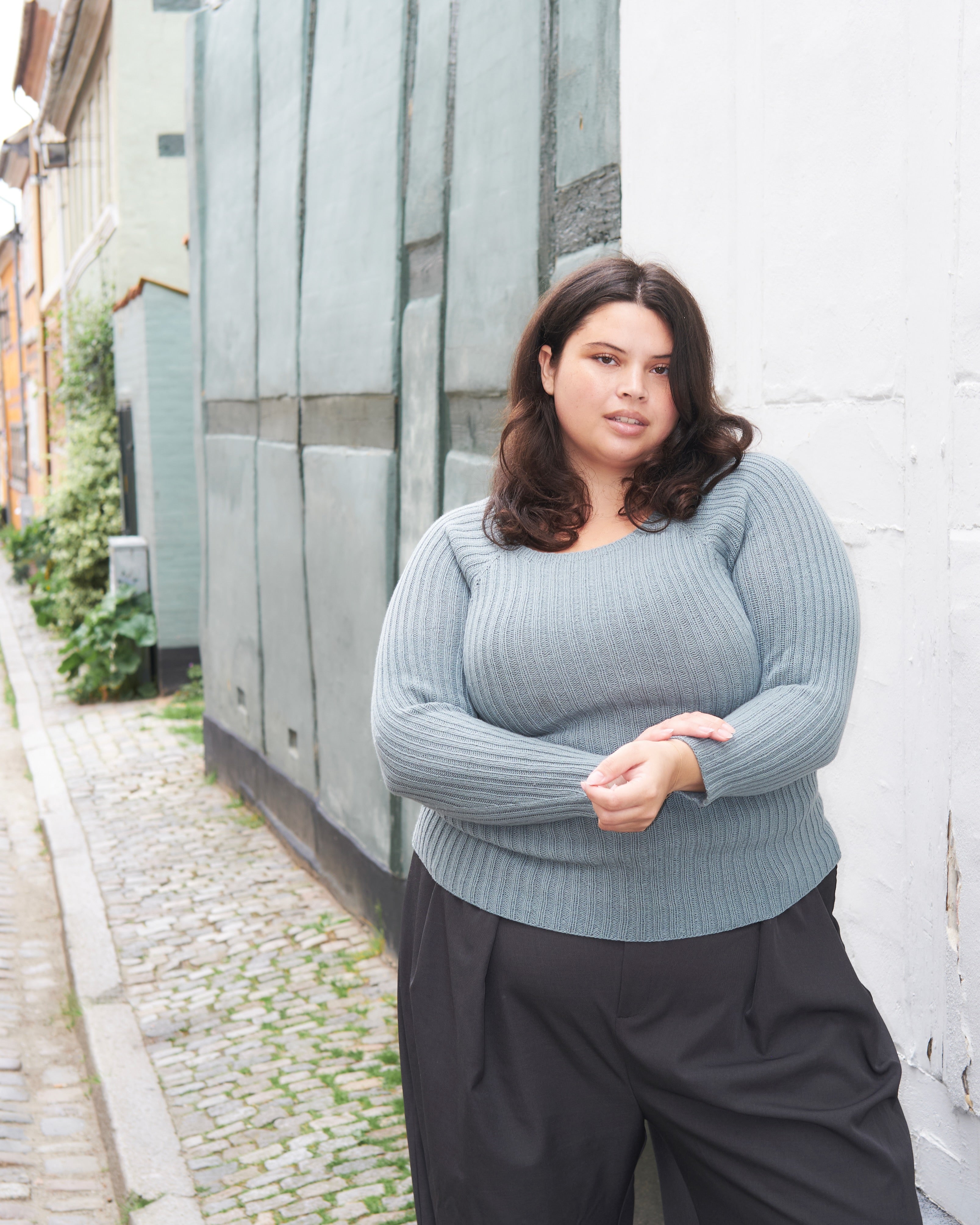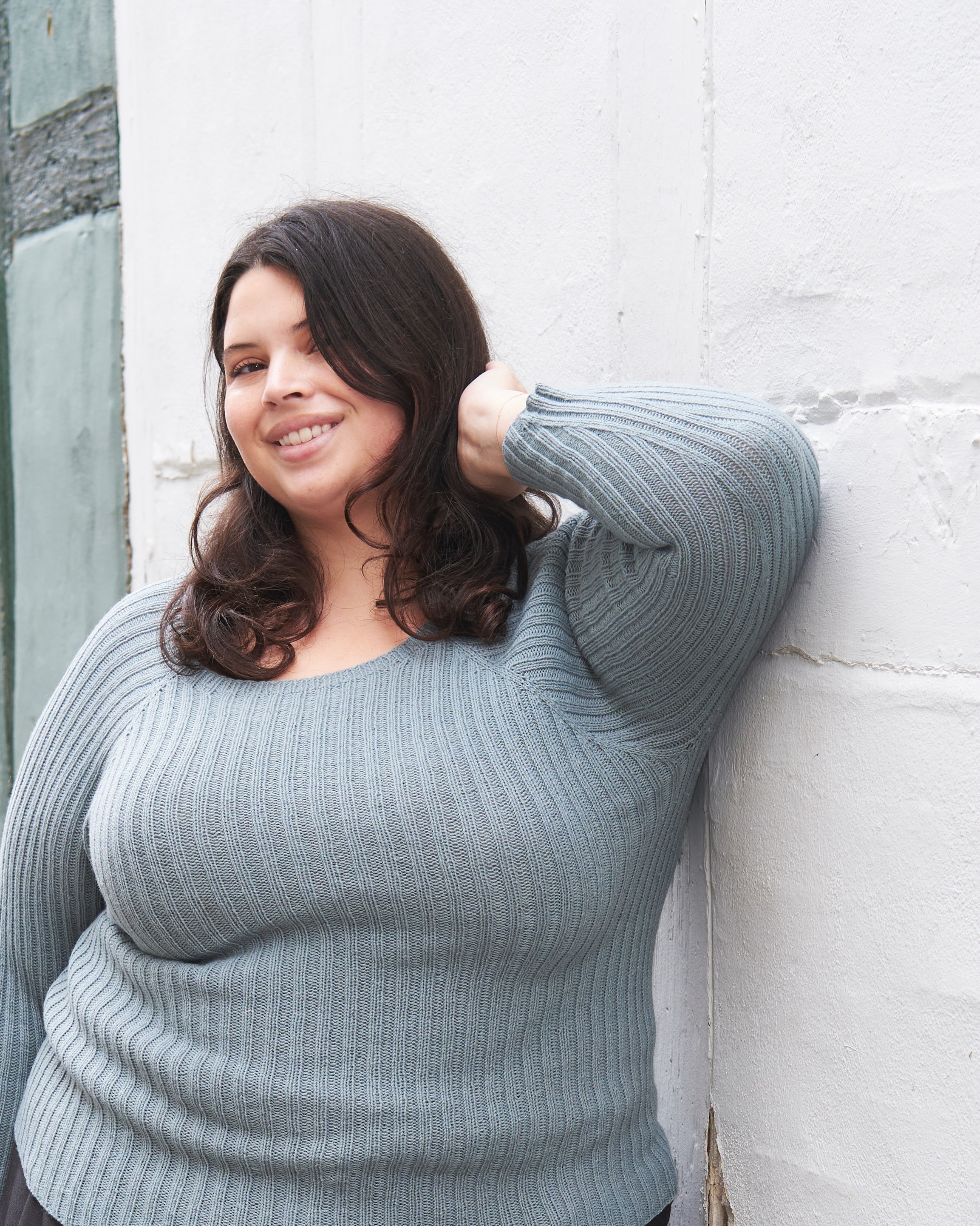 Rib Tee heeft een allover ribbelpatroon en een raglanconstructie. Het wordt van boven naar beneden in de rondte gewerkt met 1 draad Merino of Pure Silk. De mouwlengte en lichaamslengte kunnen gemakkelijk naar eigen wens worden aangepast. Het patroon geeft instructies voor zowel een versie met korte mouwen als een versie met lange mouwen. Rib Tee is bedoeld om te worden getailleerd en is daarom ontworpen met een negatieve easy. Het allover ribpatroon zorgt voor een elastische stof die uitrekt voor een goede pasvorm. De lengte van het lichaam zal korter zijn wanneer het gedragen wordt dan wanneer het plat wordt opgemeten. Om de juiste maat te kiezen, kijk je naar de 'te passen borstomtrek' metingen op de vorige pagina. Als je werkelijke borstomtrek bijvoorbeeld 98 cm [38½"] is, moet je maat M kiezen om de gewenste pasvorm te krijgen.