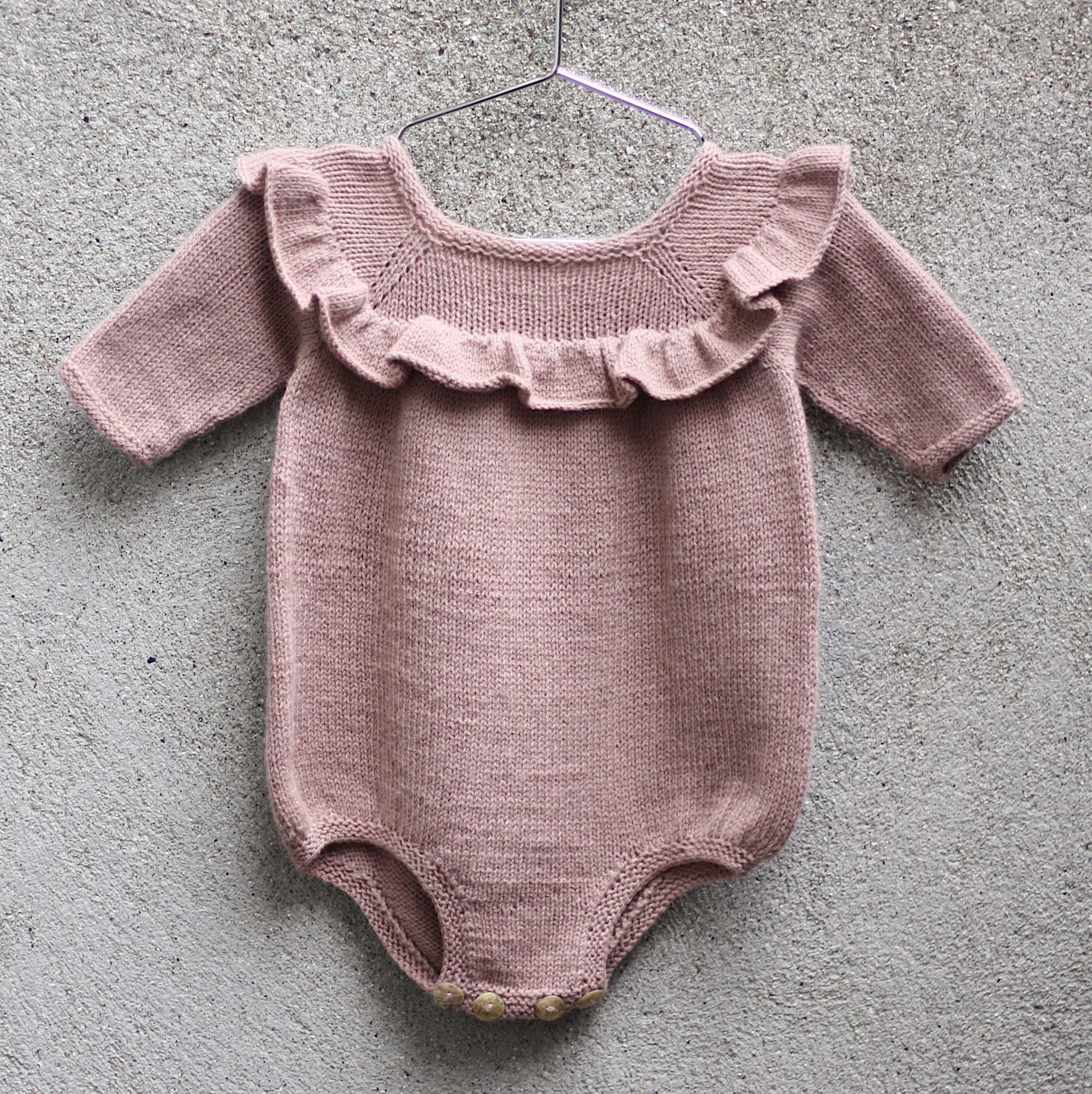 Ruffle Romper is een eenvoudige romper met een decoratieve ruche op het juk. Het wordt van boven naar beneden gebreid in tricotsteek met 1 draad Merino, Cotton Merino of Pure Silk. De romper kan met of zonder mouwen worden gebreid - een Merino versie met mouwen voor de herfst en winter, en een Cotton Merino of Pure Silk versie zonder mouwen voor de lente en zomer bijvoorbeeld, zou prachtig zijn.