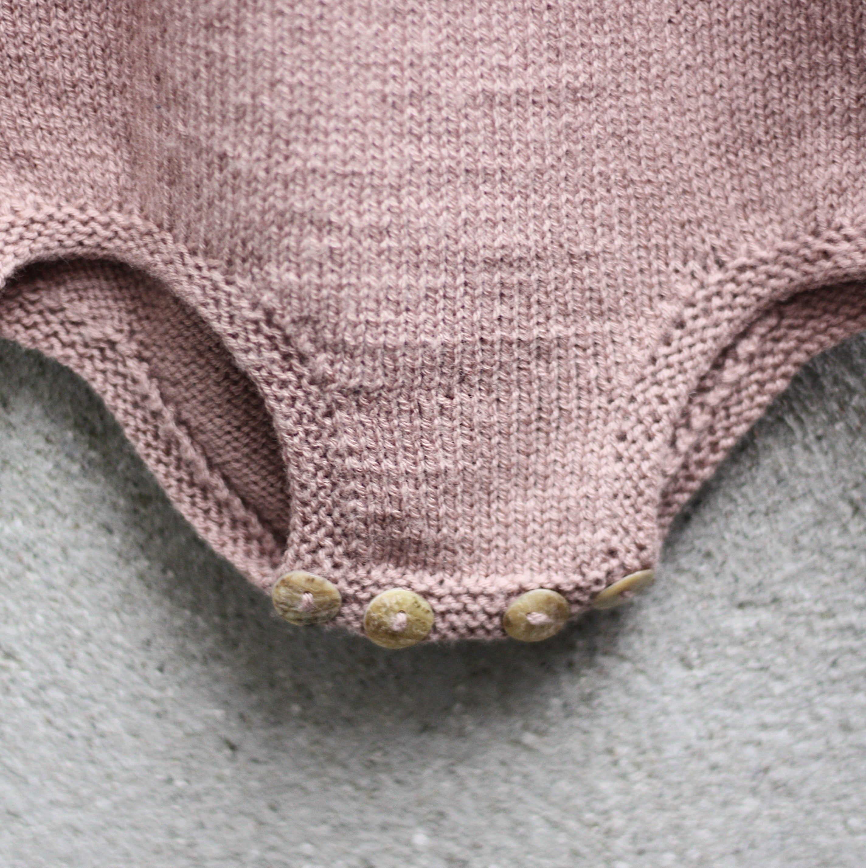 Garen: Knitting for Olive Merino, Cotton Merino of Pure Silk (250 m [273 yd] / 50 g [1.8 oz]), vingergewicht garen, 2 (2, 3, 3) bollen voor romper zonder mouwen of 2 (3, 3, 4) bollen voor romper met mouwen. Monster is in Merino, Rose Clay kleurstelling