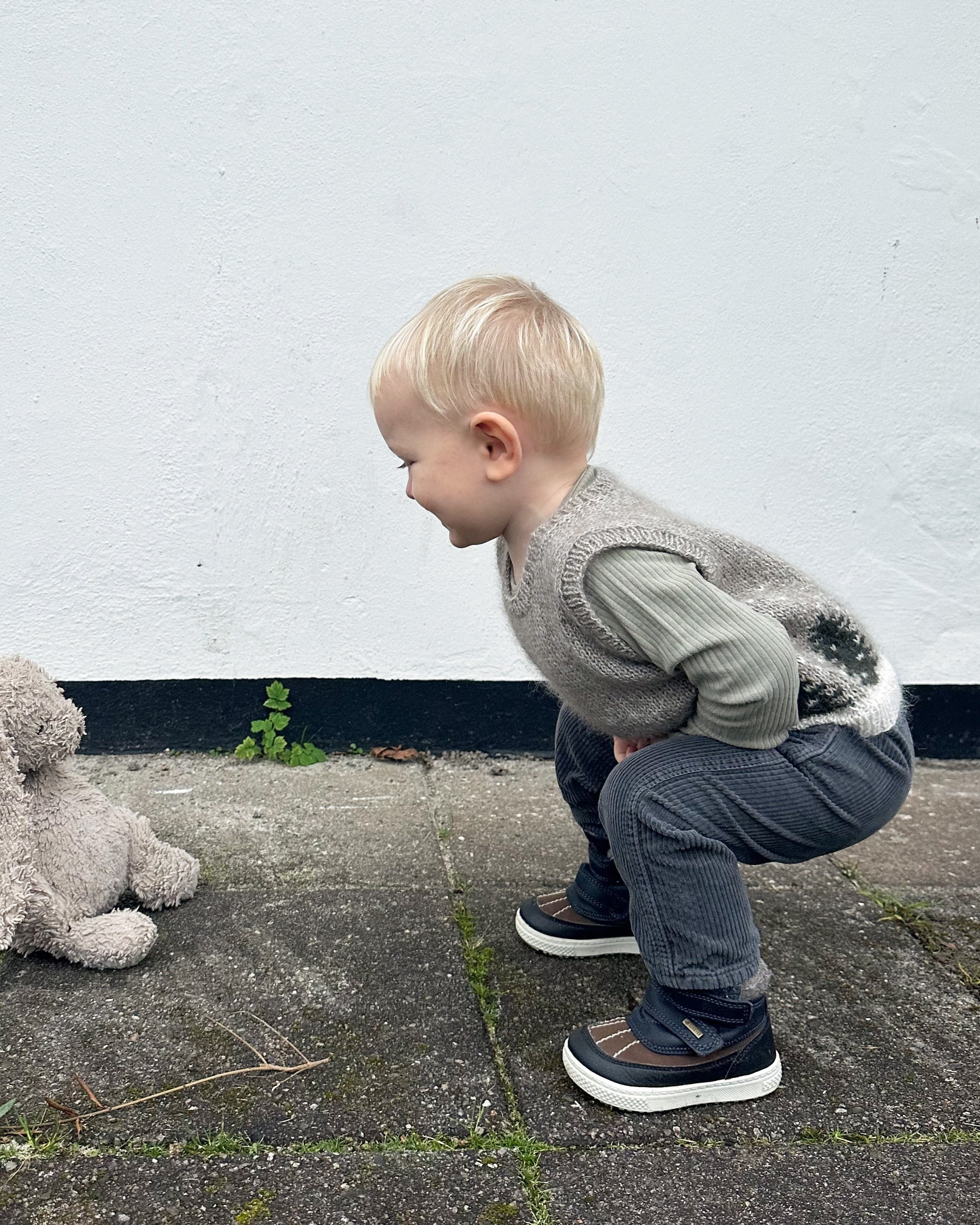 Snow Vest wordt van onder naar boven gewerkt, zowel plat als in de ronde, waarbij 1 draad Merino + 1 draad Soft Silk Mohair samen worden gehouden. Het vest heeft een Fair Isle winterlandschap met sneeuw en dennenbomen rondom de onderkant van het lijfje.