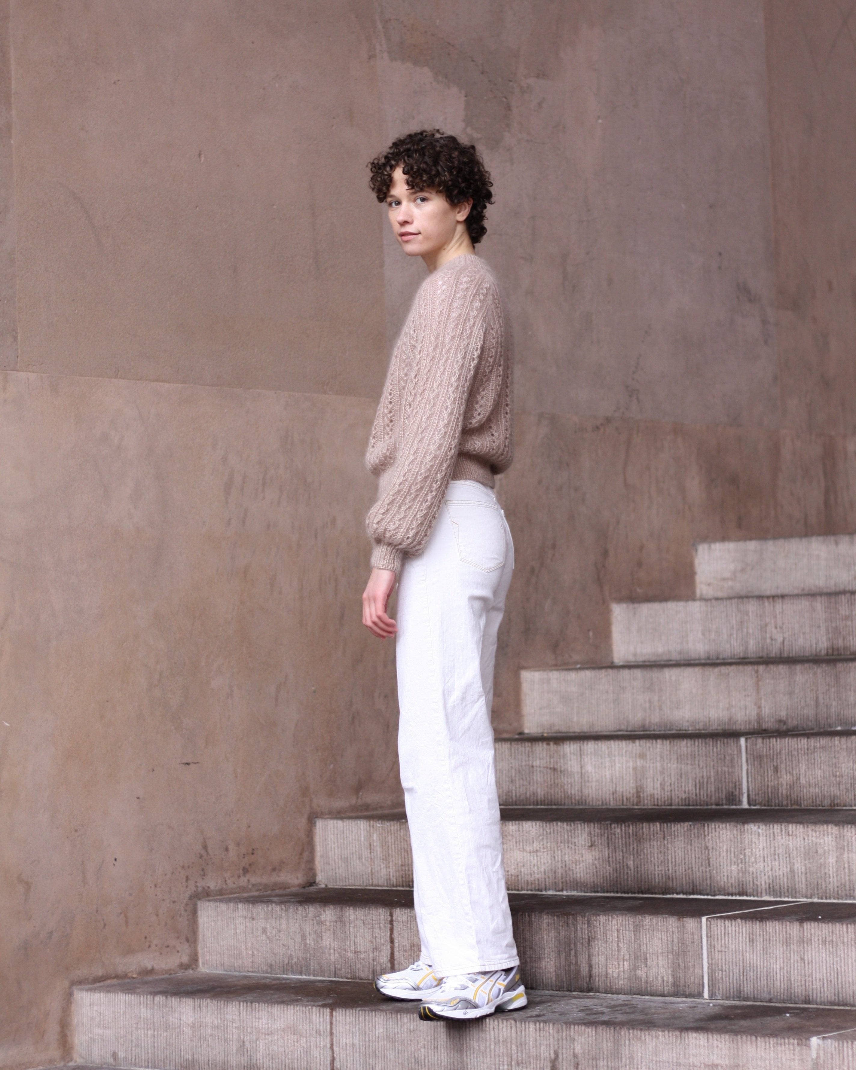 Garen: 3 strengen samen van Knitting for Olive Soft Silk Mohair (70% mohair, 30% zijde; 225 m [246 yd] per 25 gr [0.88 oz]) kantgaren; 10 (11, 12, 12, 13, 15, 17, 19) bollen