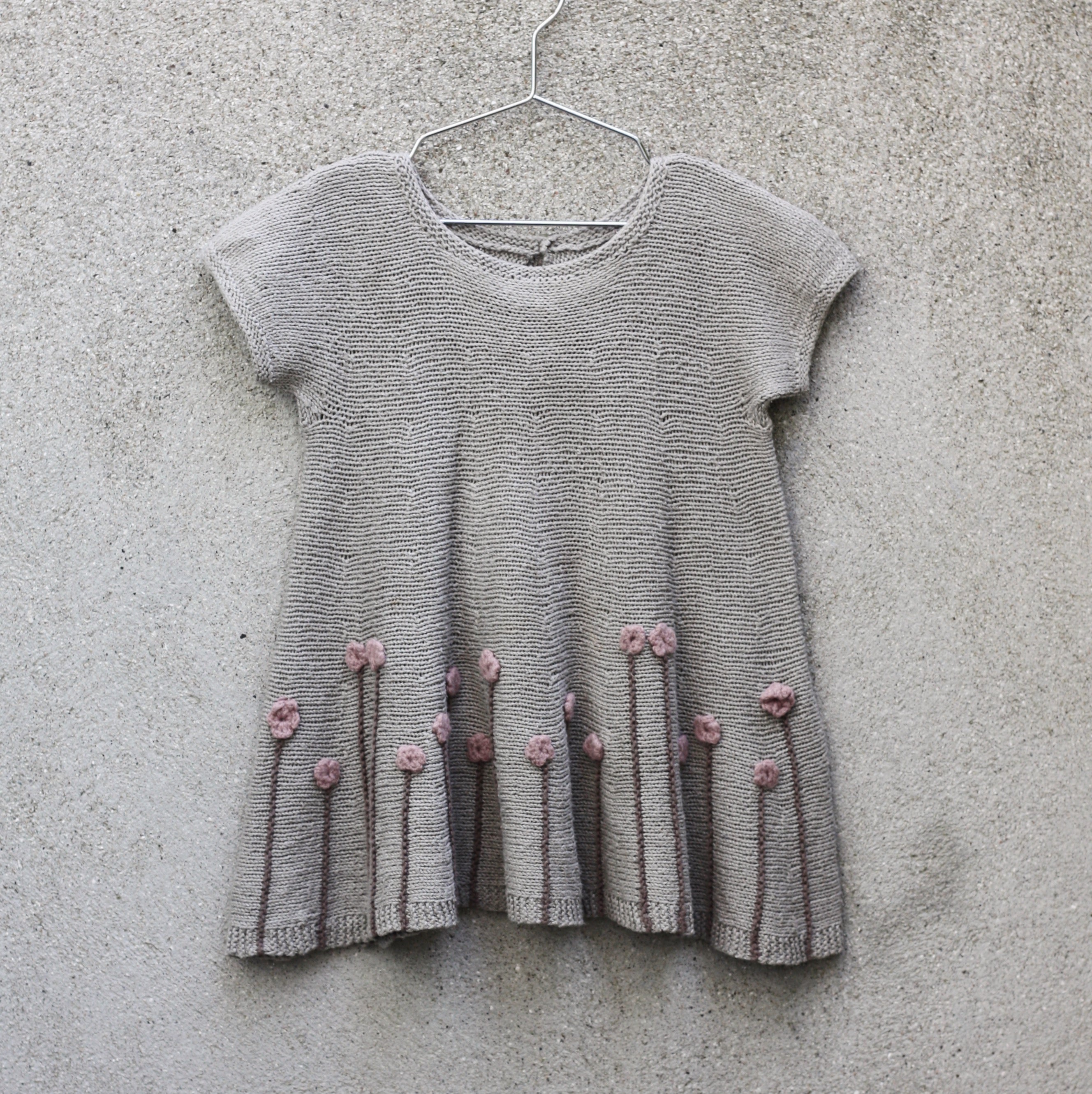Flower Dress is een eenvoudige en losse jurk in tricotsteek met bloemen rond de rok. De achterkant heeft een kleine sleutelgatopening die wordt gesloten met een knoop. Flower dress is gemaakt van 1 draad Merino, Cotton Merino of Pure Silk.