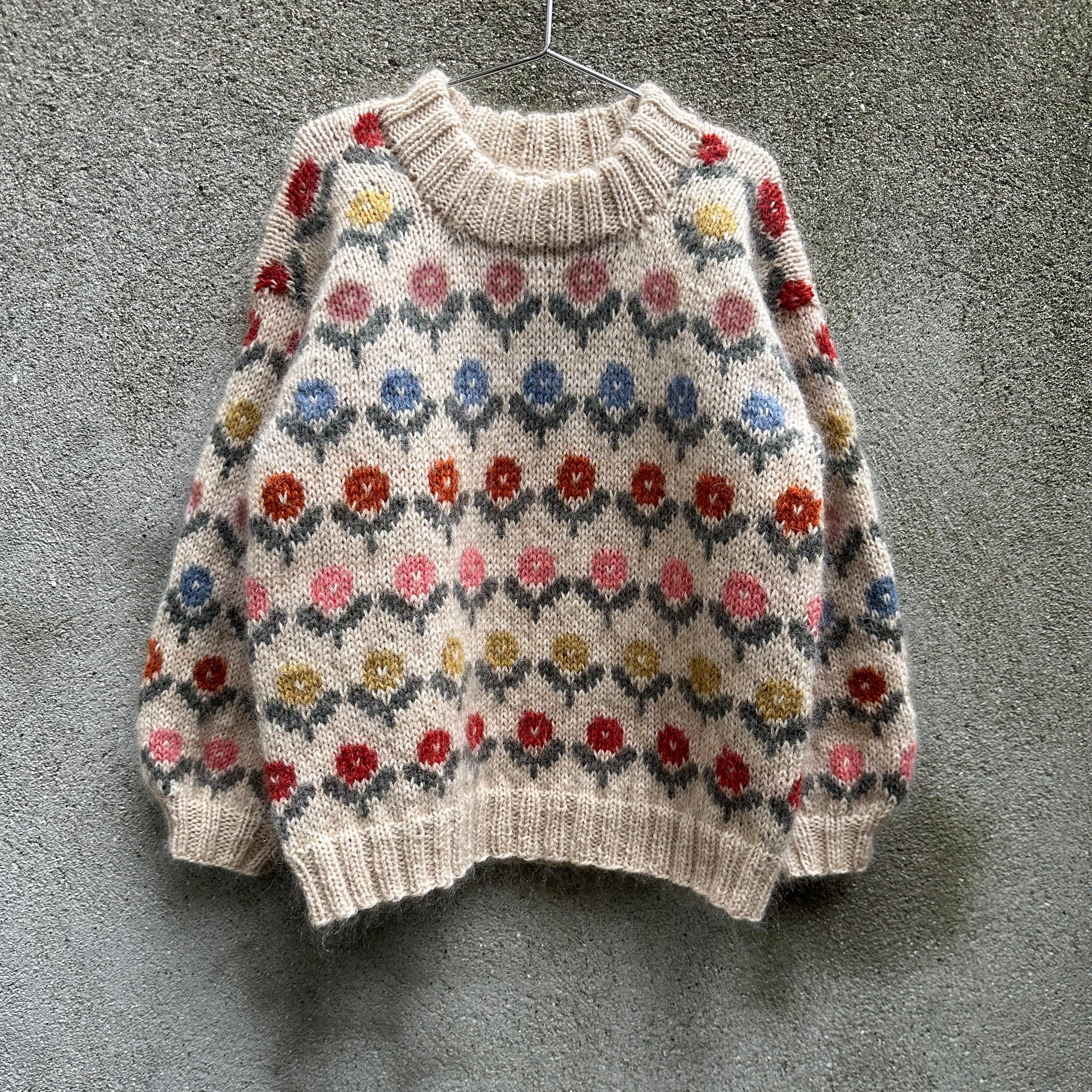 Anemone Sweater har ett heltäckande Fair Isle blommönster och ribbade kanter. Den stickas nerifrån och upp runt till underarmarna. Sedan delas arbetet och fram- och bakstycke stickas fram och tillbaka upp till axlarna. Därefter plockas ärmmaskorna upp och ärmarna stickas runt uppifrån och ner. Till sist plockas maskorna till det vikta halsbandet upp och halsbandet stickas färdigt i resår.
