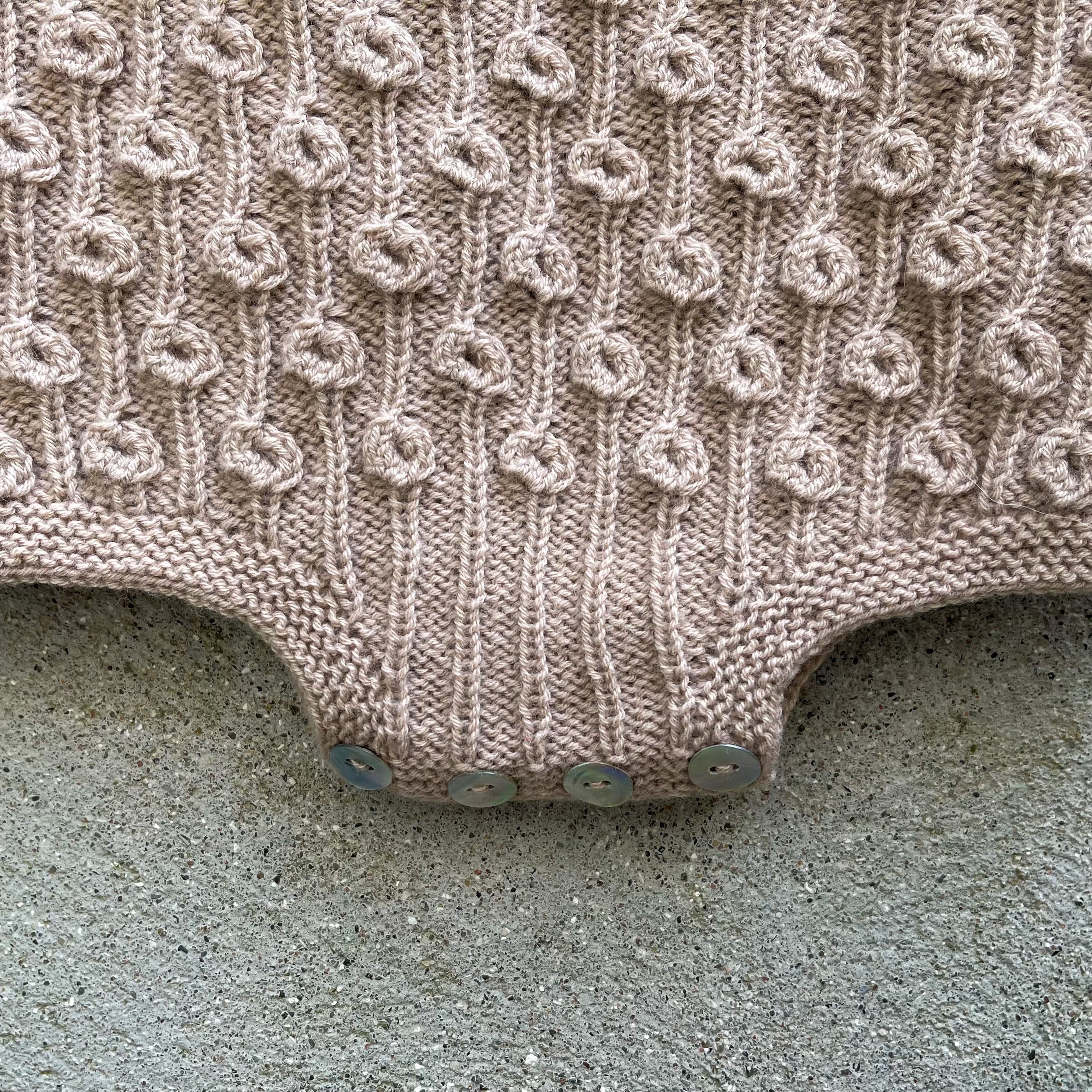 Bean Sprout Romper är en löst sittande romper med ett vackert kartlagt böngroddsmönster på kroppen. Sparkdräkten stickas nerifrån och upp med 1 tråd Merino, Cotton Merino eller Pure Silk.