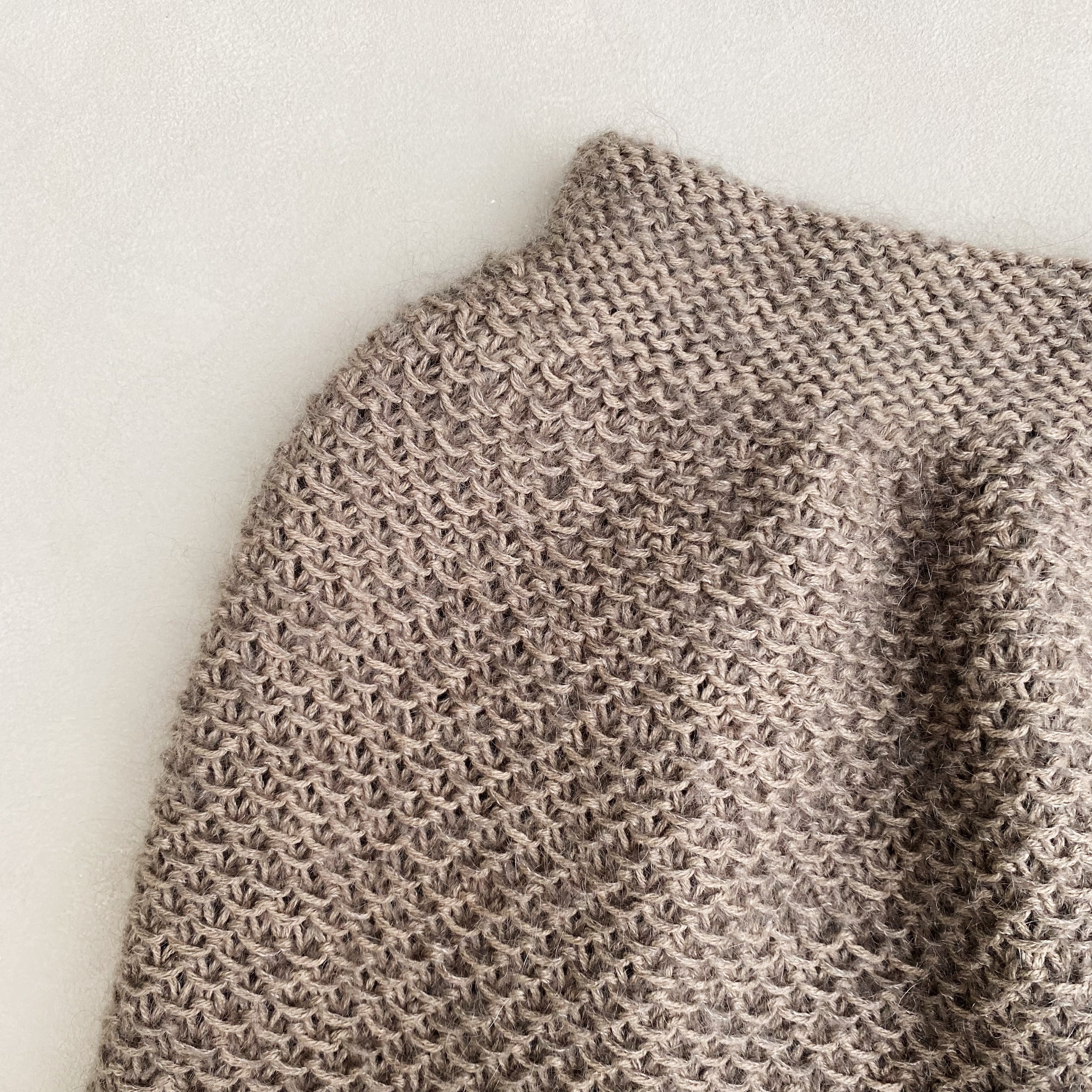 Garn: 2 trådar tillsammans: 1 tråd Knitting for Olive Merino eller Pure Silk (250 m [273 yd] per 50 gr [1.8 oz]), fingertjockt garn; 1 (2, 2, 3, 3, 4) nystan; + 1 tråd av Knitting for Olive Soft Silk Mohair (70 % mohair, 30 % silke; 225 m [246 yd] per 25 gr [0.88 oz]) spetsgarn; 2 (2, 2, 3, 3, 4) nystan Provet är i storlek 2 år, i Knitting Knitting for Olive Pure Silk, Cardamom colorway; + Knitting for Knitting for Olive Soft Silk Mohair, färgställning Dusty Moose