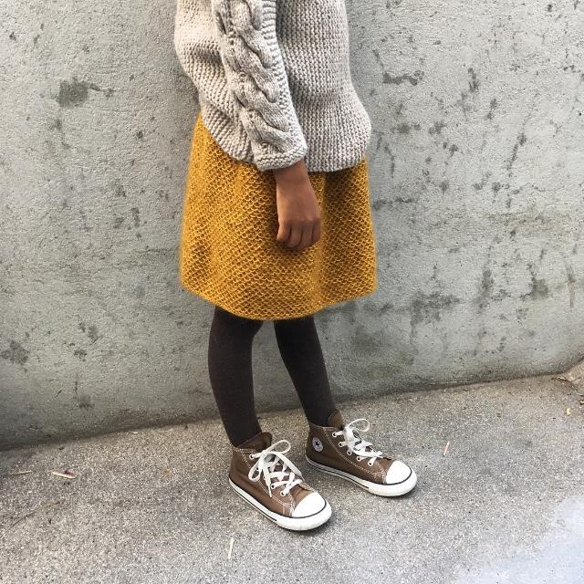 Mullet Skirt är en enkel design med lite formgivning men en rik, intressant textur som kommer både från slip stitch-mönstret och användningen av två trådar garn - en av de rekommenderade garnerna och en fluffig mohair- och silkesblandning. Resultatet är en ren njutning att sticka och en fröjd för alla små flickor - från 1 till 10 år - att bära och snurra runt i. Den stickas runt nerifrån och upp och har ett foder för resår i midjan. Du kommer också att ha roligt när du väljer din egen färgkombination, antingen ton i ton eller kontrasterande, från vårt urval av garner.